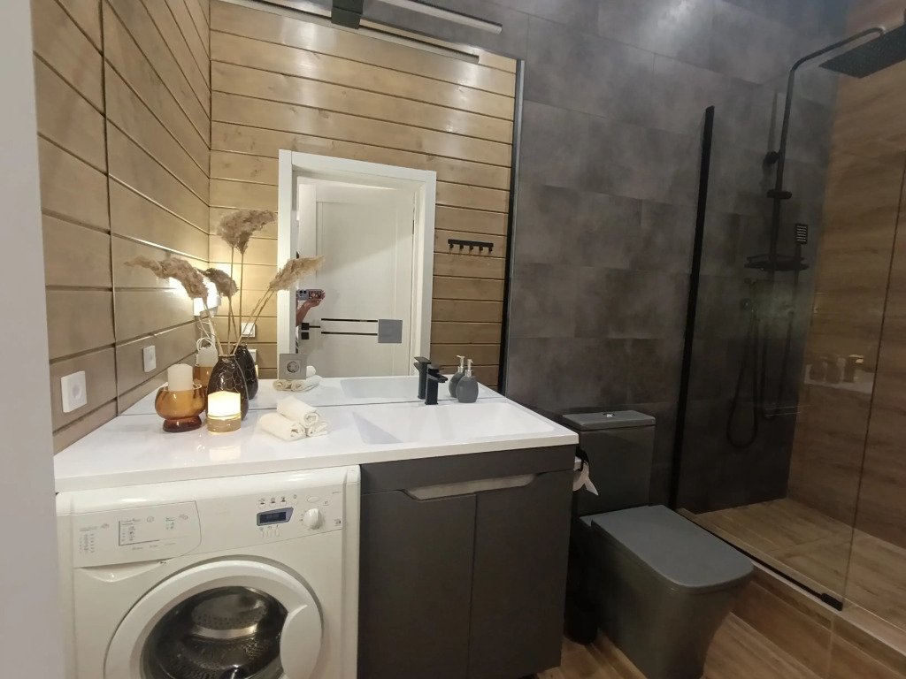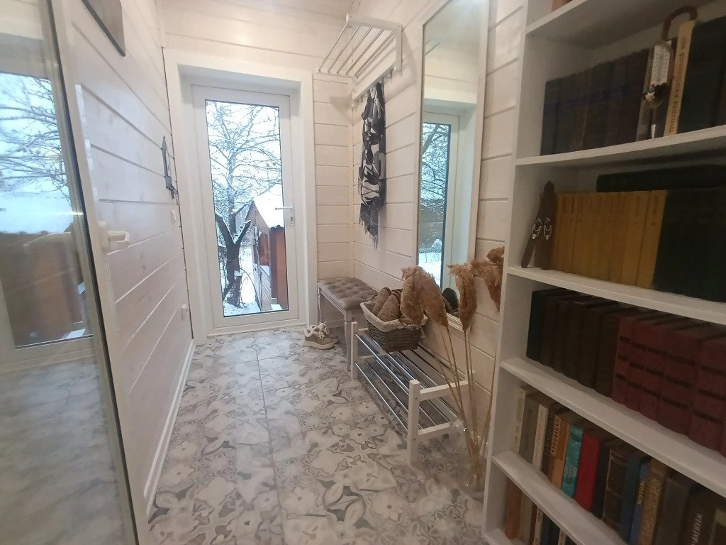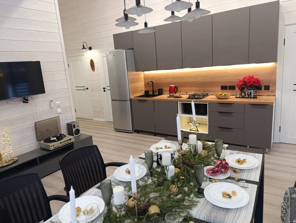 Внутреннее пространство дома включает уютную кухню с газовой плитой, микроволновой печью, полным набором посуды и столовых приборов. Для гостей подготовлены чай и кофе, а также большой обеденный стол со стульями. В доме есть книги, проигрыватель с коллекцией старых пластинок. В трёх спальнях установлены двуспальные кровати, в первой спальне также предусмотрен вместительный шкаф-купе. Для удобства гостей предоставляются бесплатный Wi-Fi, телевизор, фен, постельное бельё и полотенца. На территории имеется мангал с шампурами и решётками.
