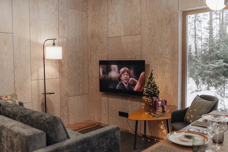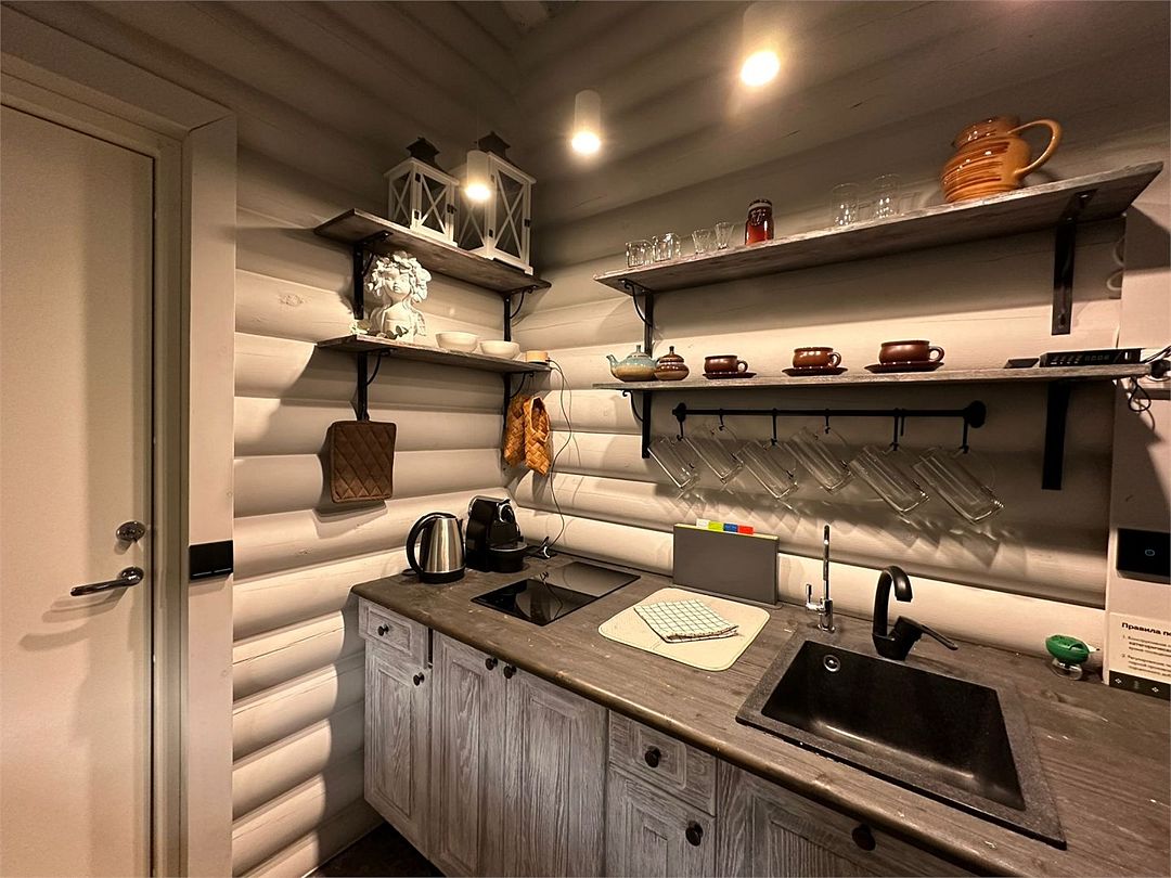 Зона кухни электрическая плита (2 комфорки), минихолодильник с морозилкой, набор посуды для приготовление пищи и сервировки стола, чайник, кофемашина капсульная, телевизор, умная колонка.