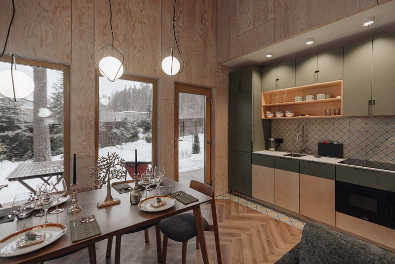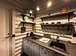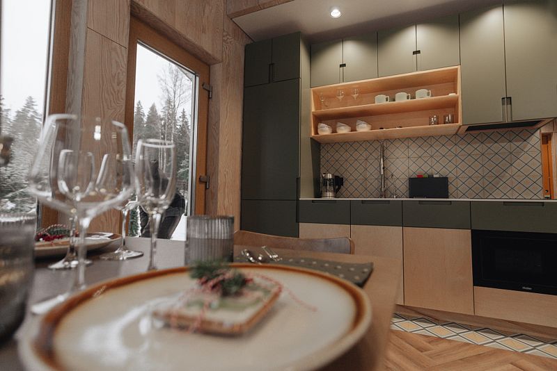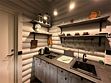 В коттедже большая оборудованная кухня со встраиваемой бытовой техникой, посудой для приготовления пищи и сервировки стола.