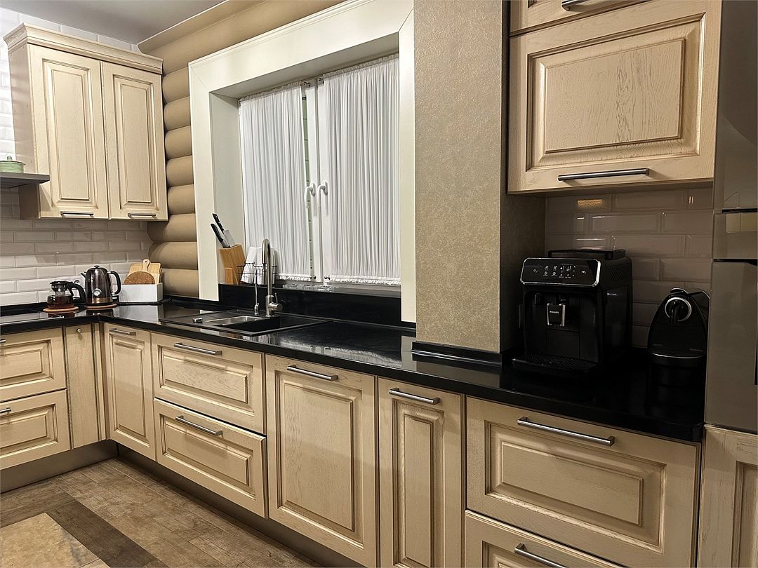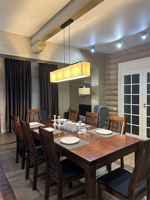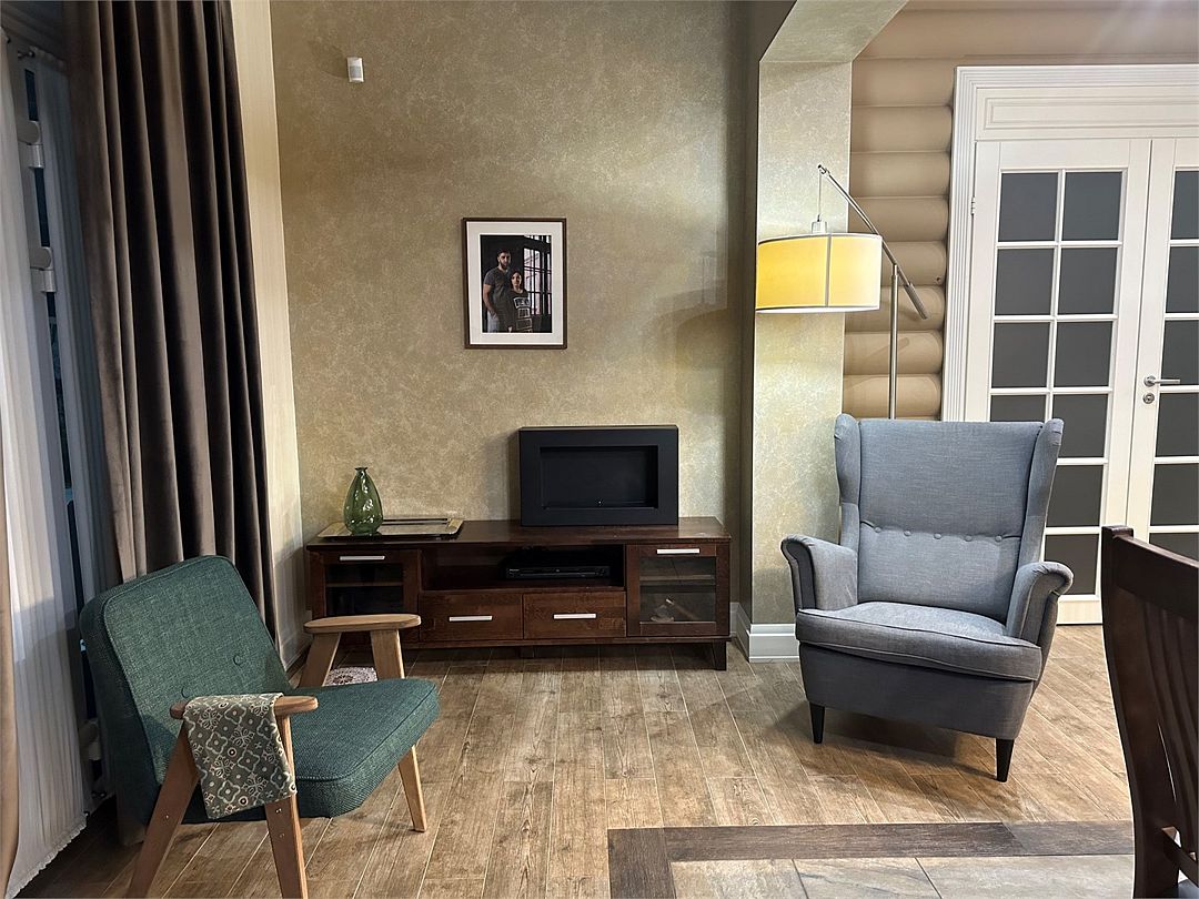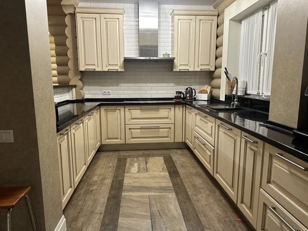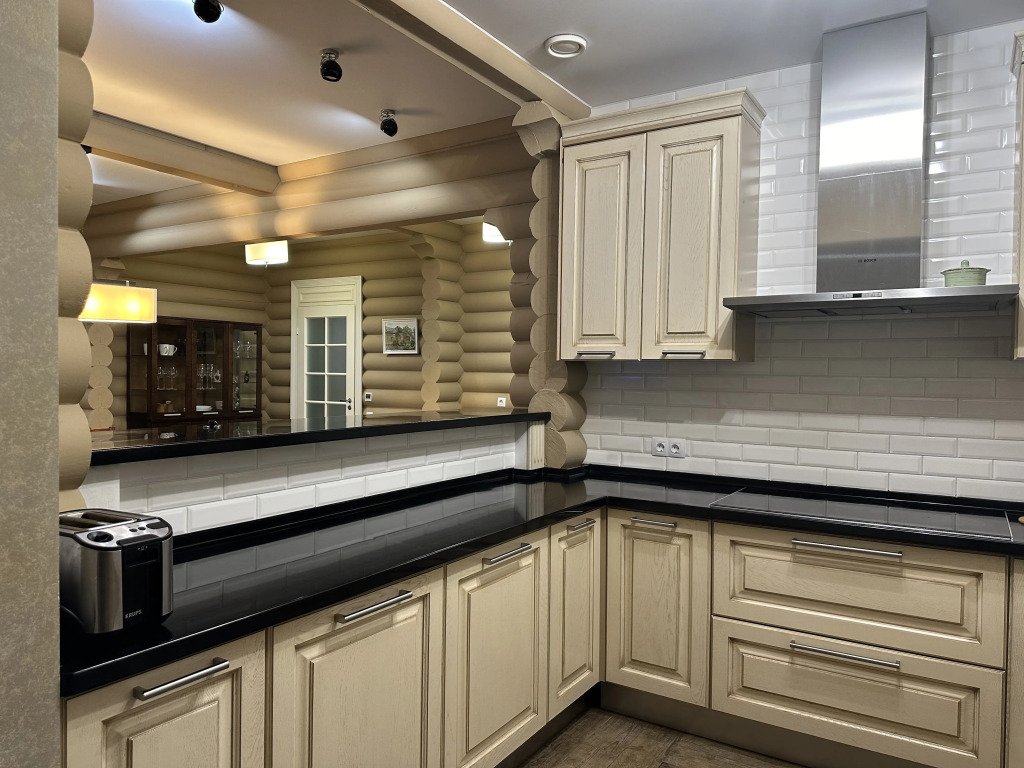 - Кухня: холодильник, морозильная камера, фильтр для воды, варочная поверхность, СВЧ, вытяжка, кофемашина, посуда для приготовления пищи и сервировки стола 6 персон;