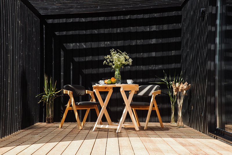 В доме комфортная двуспальная кровать, кухонная и обеденная зоны и современный санузел с необходимыми туалетными принадлежностями и полотенцами, а на террасе шезлонги и зона для барбекю.