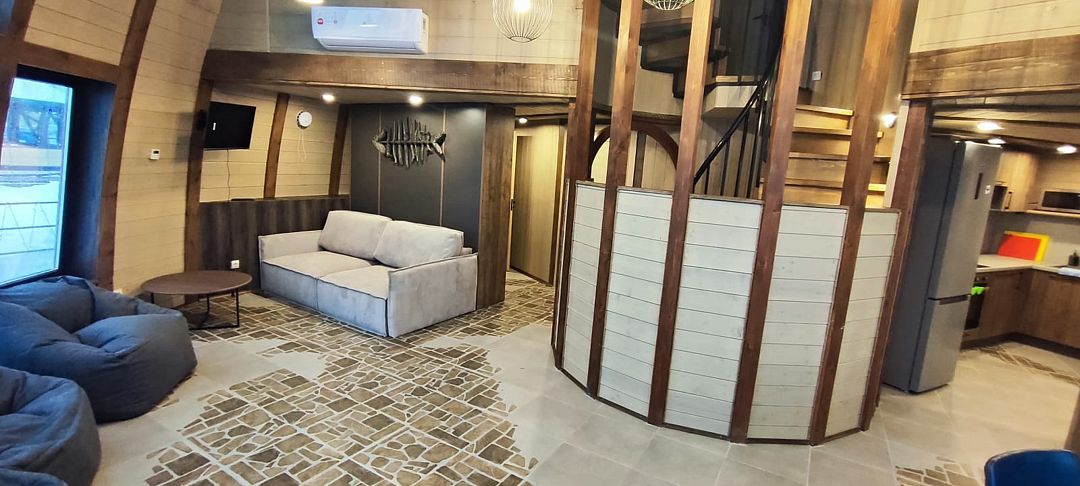 1 этаж — гостиная-столовая (спутниковое TV), диван, полностью оборудованная кухня, санузел.