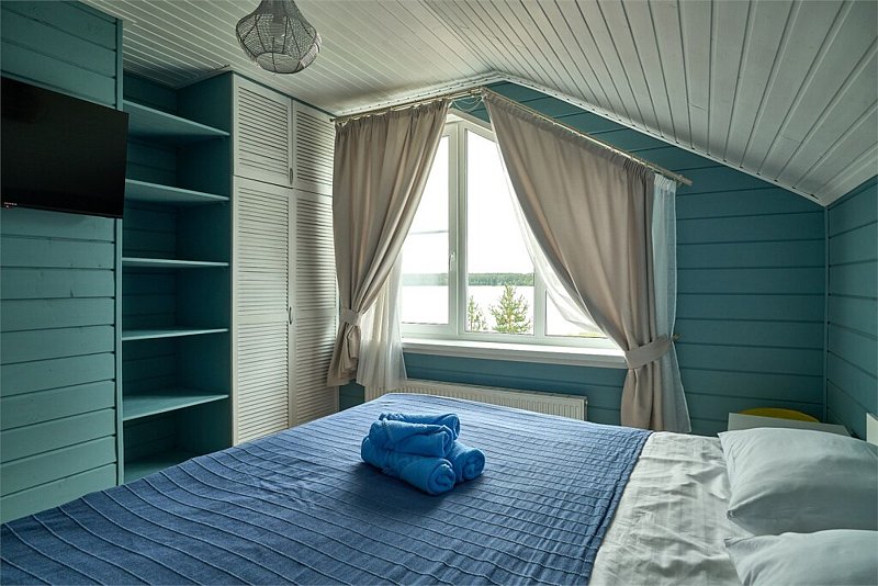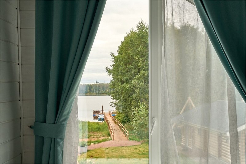 Двухэтажный коттедж с тремя отдельными спальнями и большой гостиной с полноценной кухней (вся техника и посуда) с видом на озеро. Два санузла.