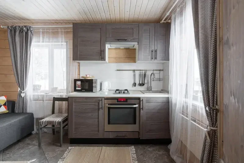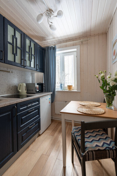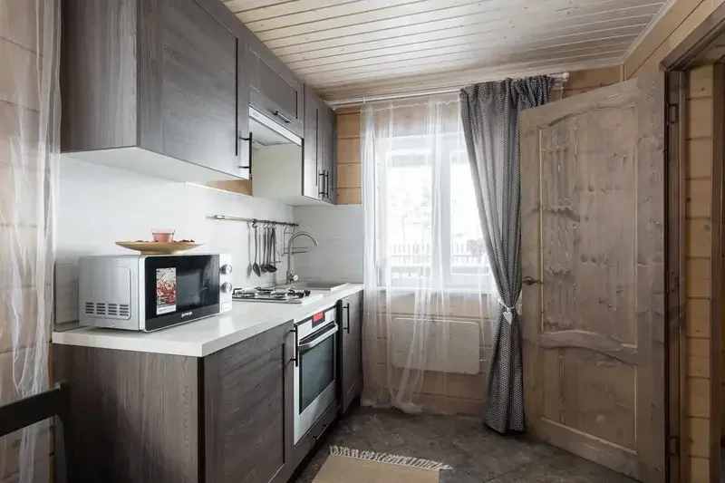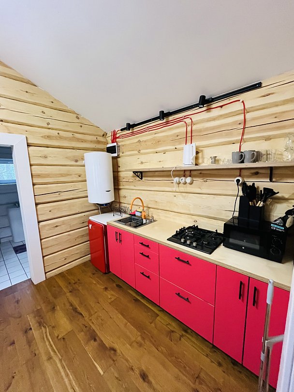 - Мини-кухня: холодильник, газовая плита, микроволновая печь, электрический чайник, набор посуды для приготовления еды, набор посуды для сервировки на 2 человека, стол, стулья.