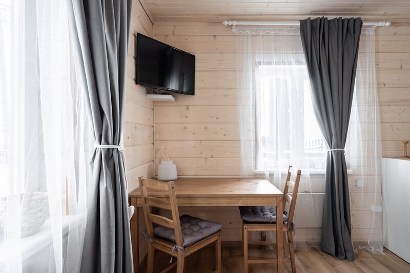Система отопления представлена электрическими обогревателями, что позволяет поддерживать комфортную температуру в доме. Освещенная терраса со столом и скамейками приглашает вас насладиться отдыхом на свежем воздухе. В стоимость проживания включены: постельное белье, полотенца для каждого гостя, а также одноразовые ванные принадлежности (шампунь, мыло и гель для душа). Обратите внимание, что детская кроватка не предоставляется! Каждый дом оборудован мангальной зоной для любителей отдыха на свежем воздухе. Размещение с животными возможно за дополнительную плату.