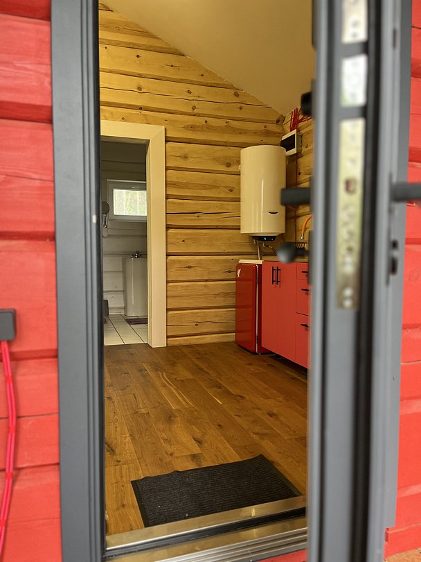 Домик из двух частей, соединенных террасой. Одна половина состоит из кухни гостиной с раскладным двуспальным диваном, туалетом с душевой кабиной. Вторая половина это две отдельных спальни.