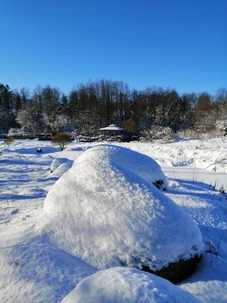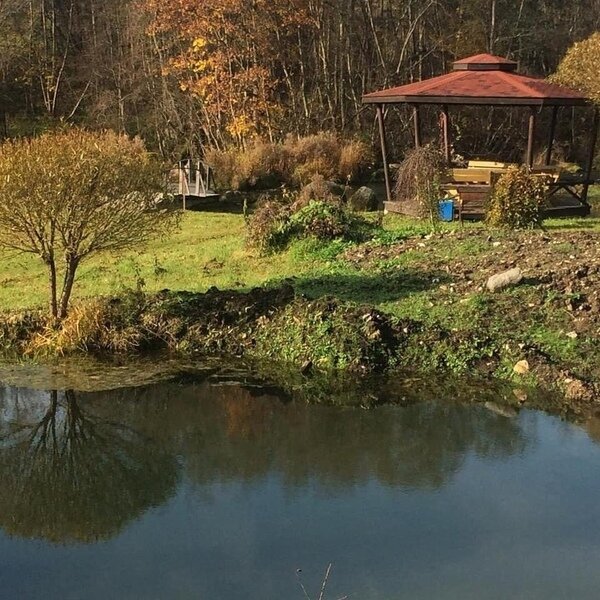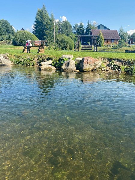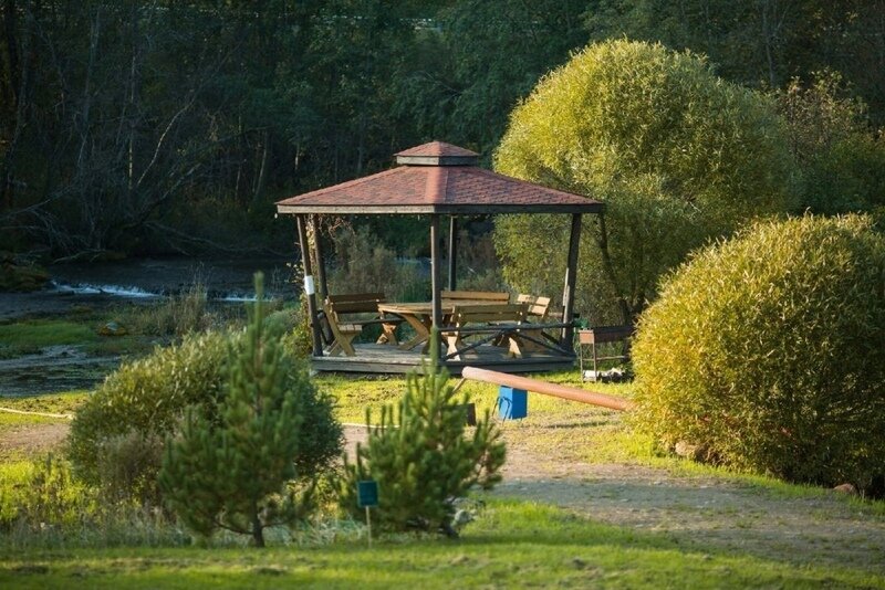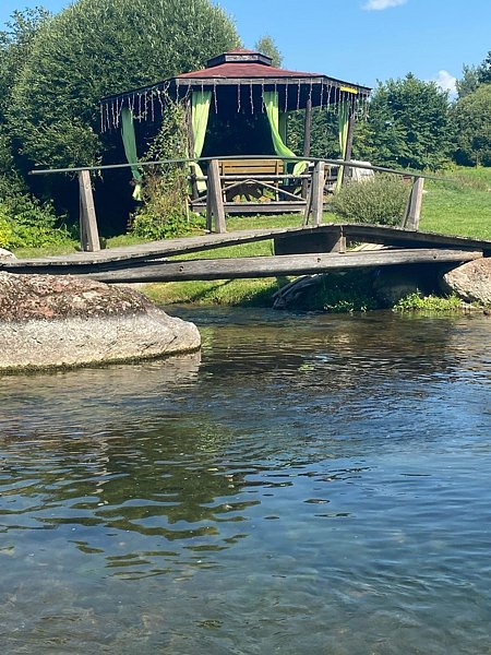 - Чистая родниковая речка, которая не замерзает, с большой беседкой, мангальной зоной и пляжем;