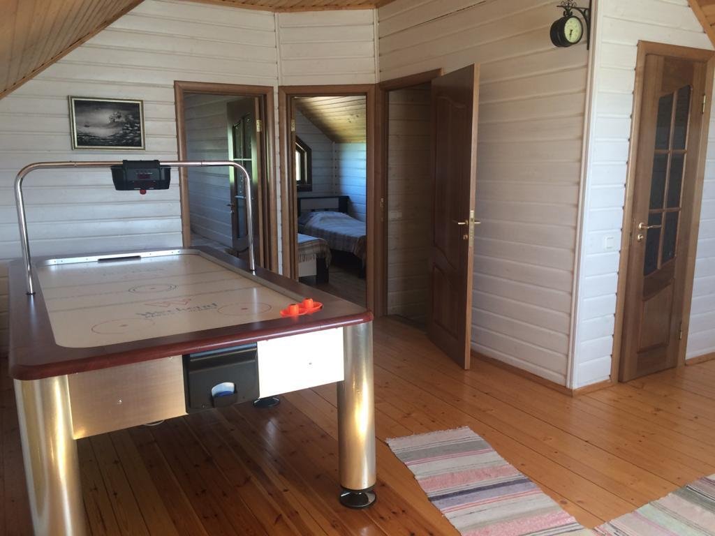 Лестница на второй этаж оборудована защитой от свободного доступа маленьких детей. На втором этаже имеется большой холл с аэрохоккеем и раскладным диваном, 2 спальни, в каждой по 2 полутороспальные кровати, санузел. Два дополнительных спальных места — это евро-раскладушки.