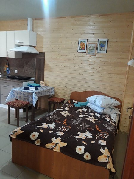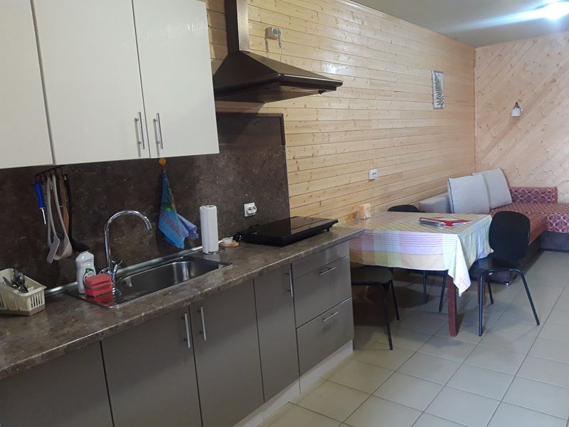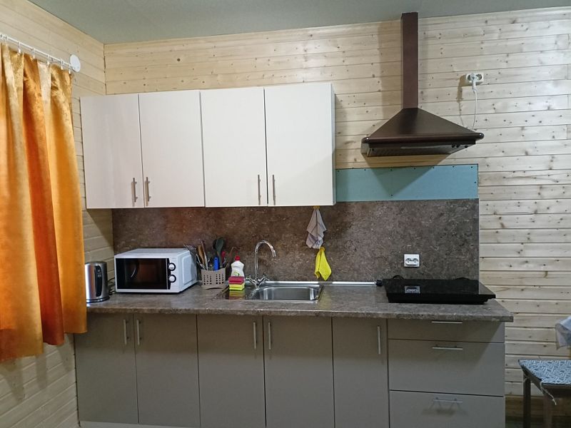 На кухне есть все необходимое для приготовления пищи (микроволновка, индукционная плита, большой холодильник с морозильной камерой, посуда, раковина). В номере есть санузел с душем и раковиной. Полы везде подогреваемые. Выход из апартаментов на террасу, где можно расположиться за столом. Рядом со входом удобный большой мангал под навесом.