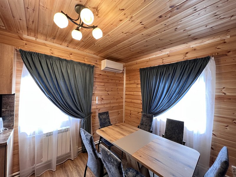 В доме 3 спальни (в каждой двуспальная кровать), кабинет с двуспальным диваном и зал, совмещенный с кухонной зоной, с двуспальным диваном, столом и стульями, 2 санузла с душевыми кабинами. В доме газовое отопление. Установлен кондиционер.
