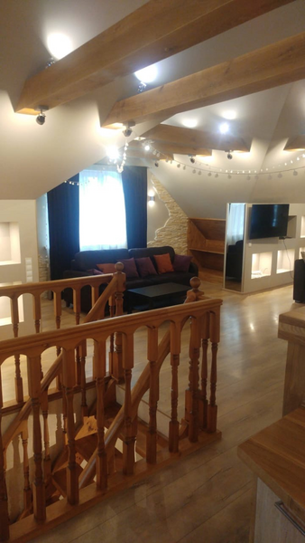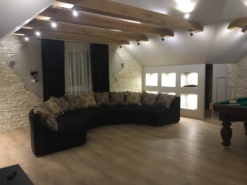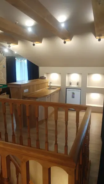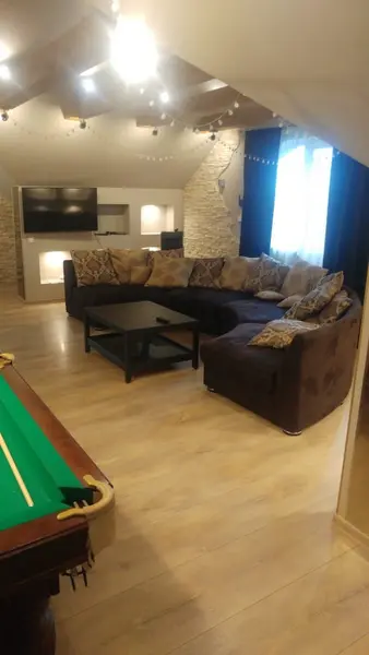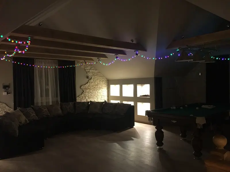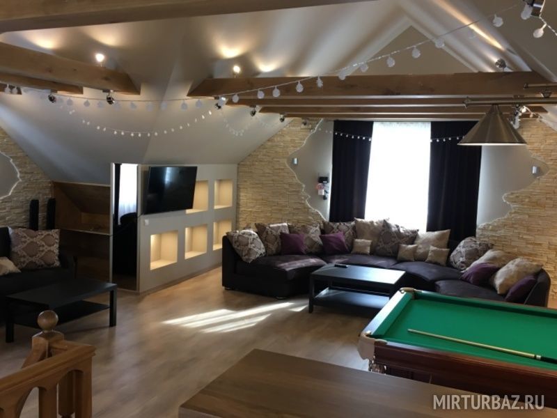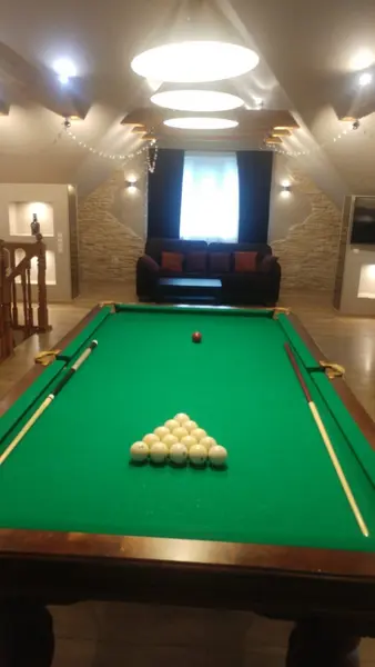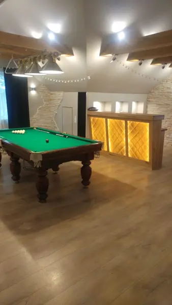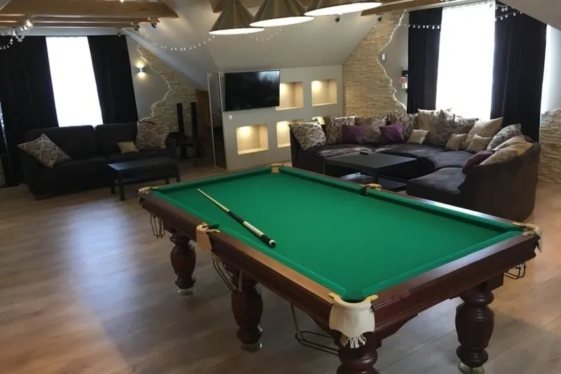 Аренда включает в себя первый этаж с большим столом. И третий этаж с бильярдом и баром.
