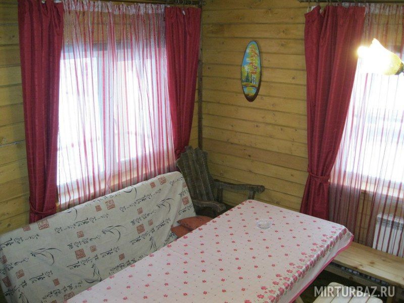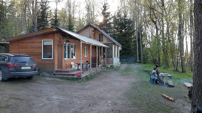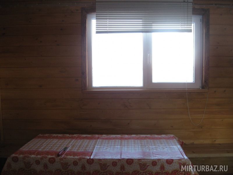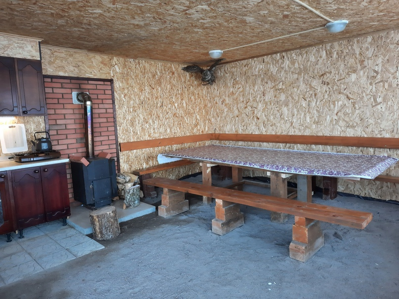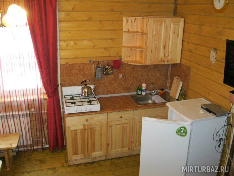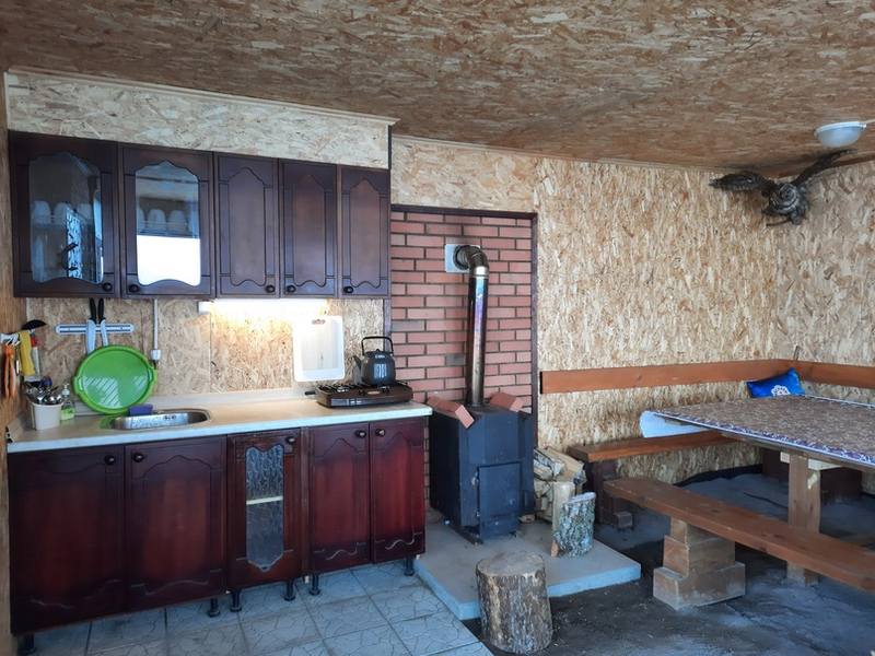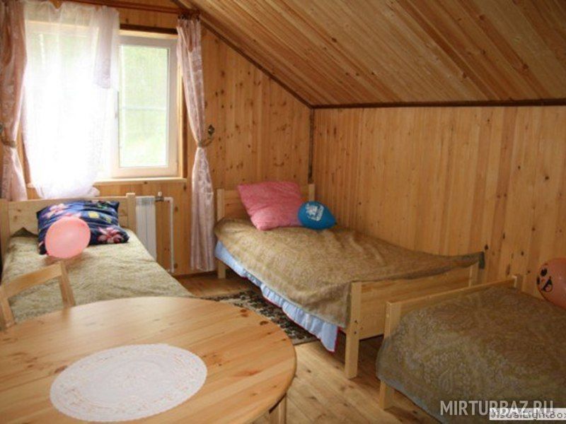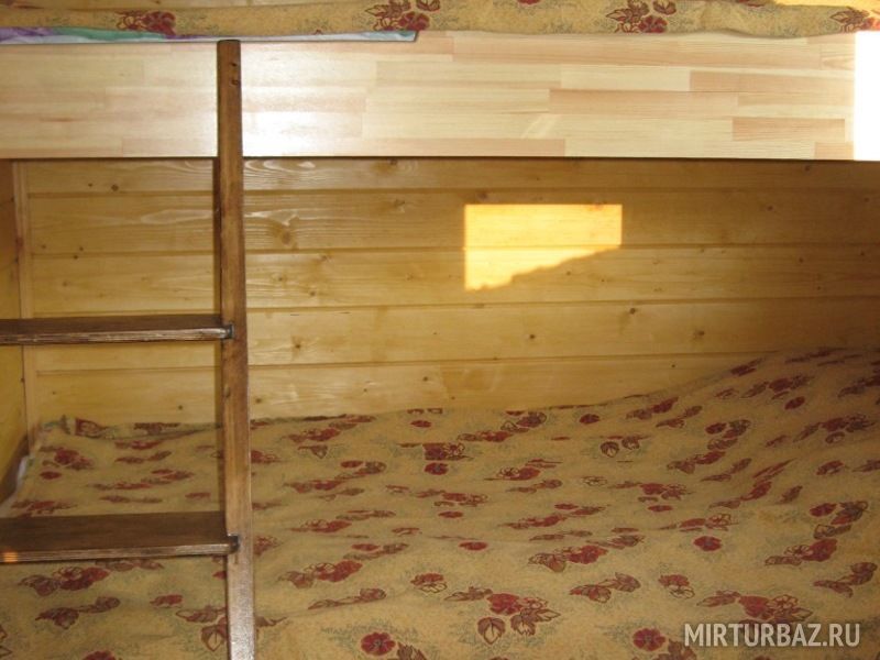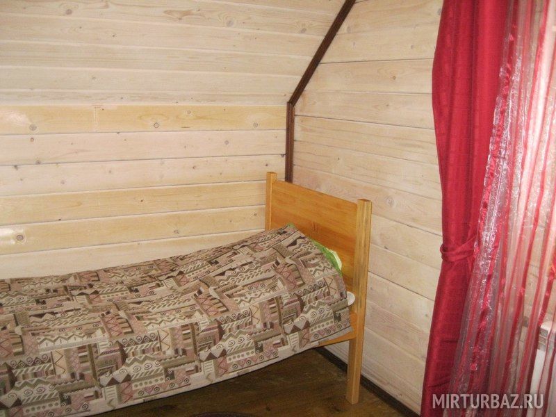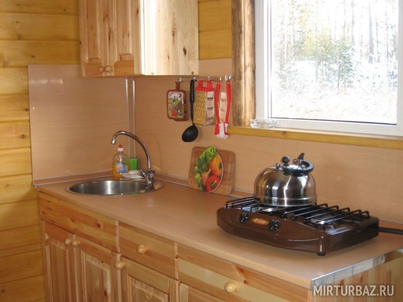 В спальне 3 кровати: одна большая и две односпальные. На кухне дровяная печь, кухонный уголок с газовой плиткой и всей необходимой посудой, мойка. На улице стол со скамейками под навесом, мангал. Туалет и душ-отдельная пристройка в центре базы.