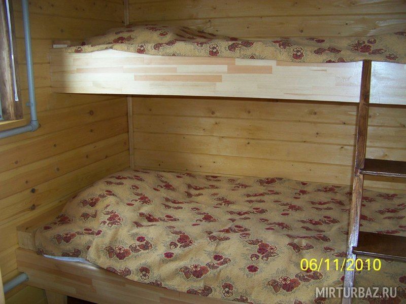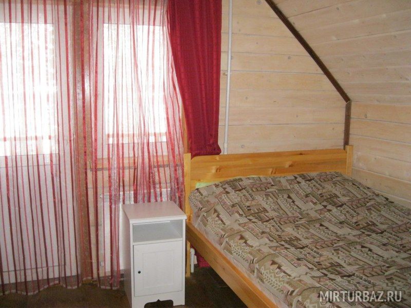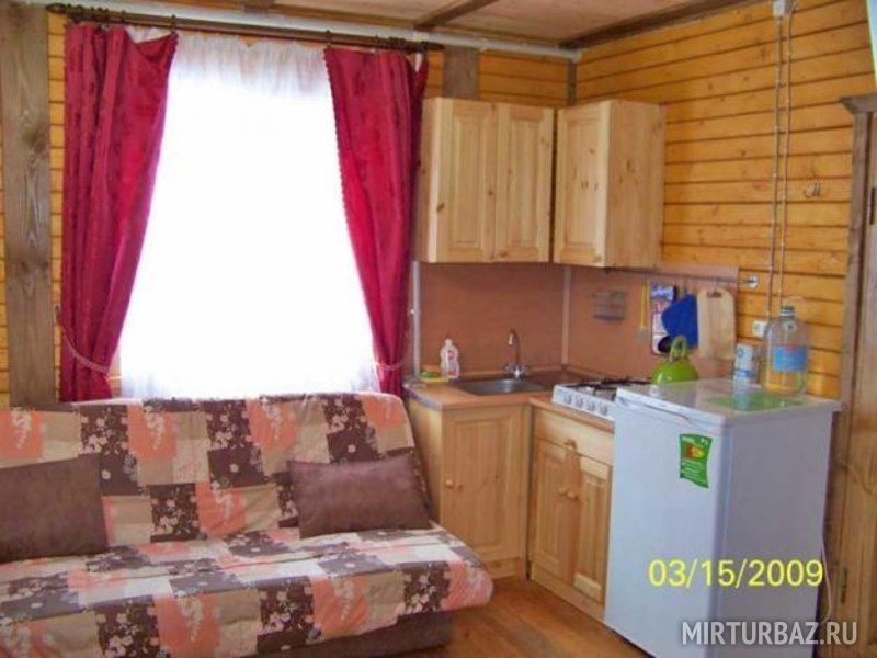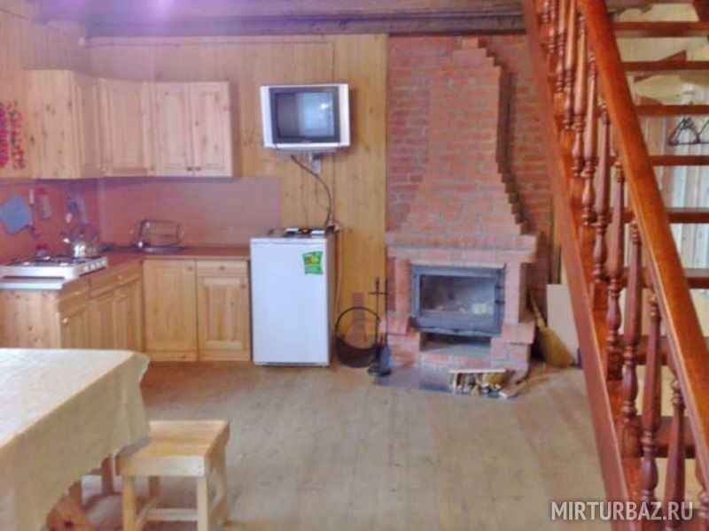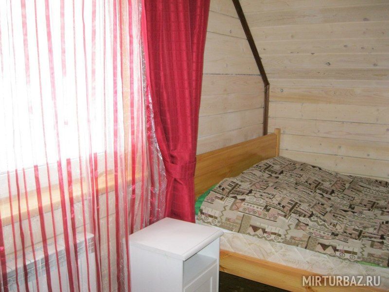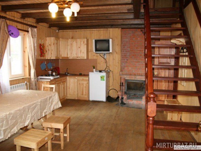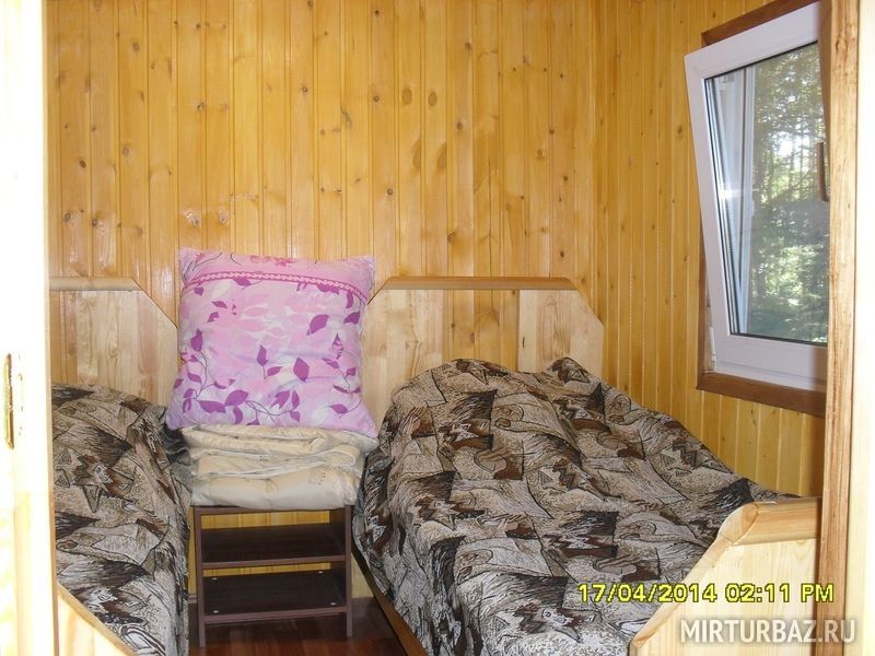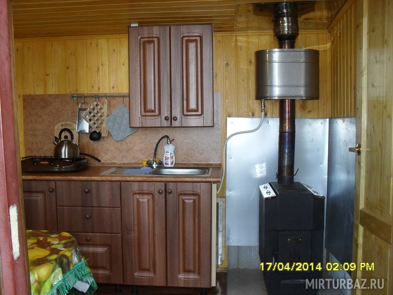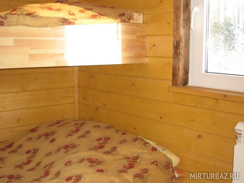 В спальне 3 кровати: одна большая и две односпальные. На кухне дровяная печь, кухонный уголок с газовой плиткой и всей необходимой посудой, мойка. На улице стол со скамейками под навесом, мангал. Туалет и душ-отдельная пристройка в центре базы.