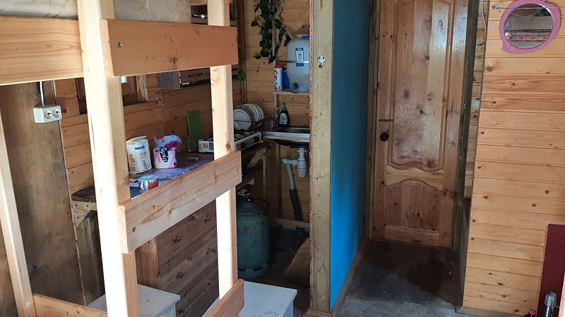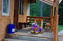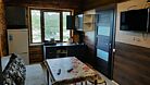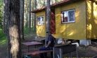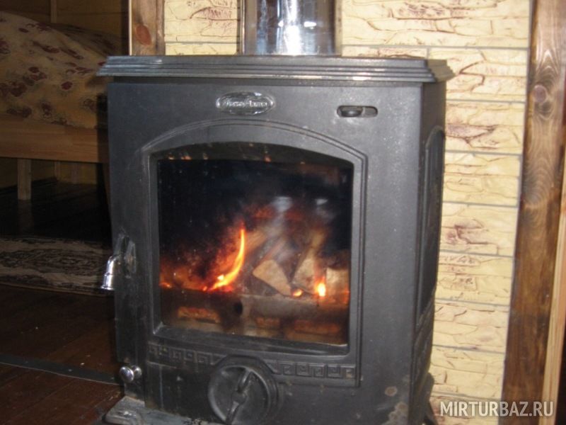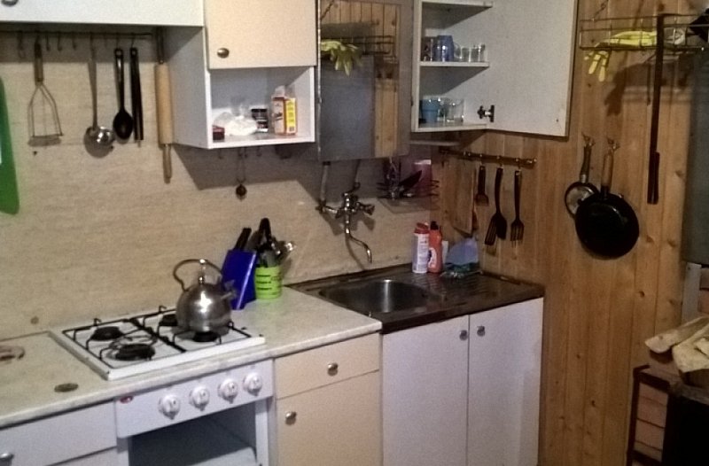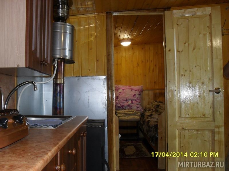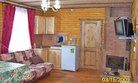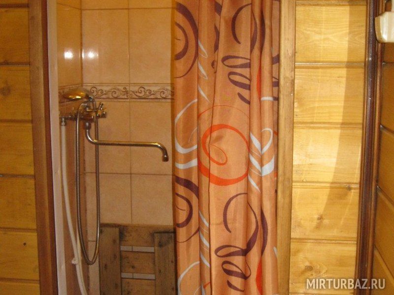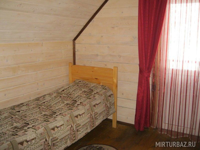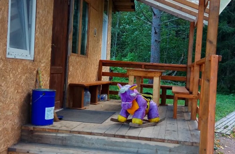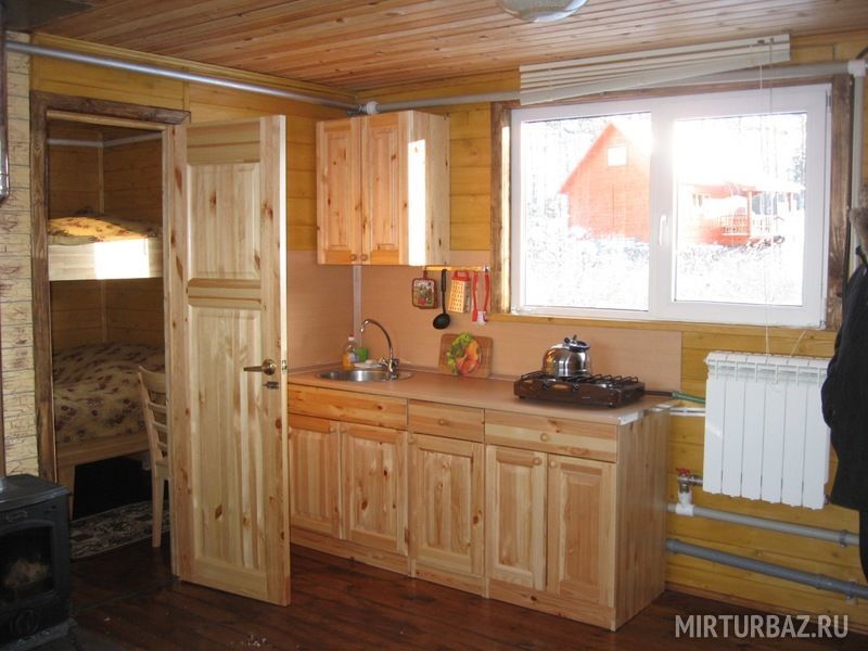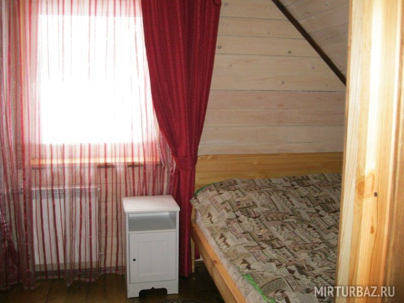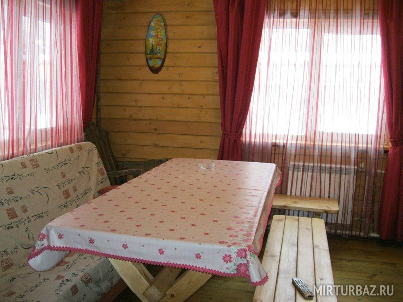 В спальне 3 кровати: одна большая и две односпальные. На кухне дровяная печь, кухонный уголок с газовой плиткой и всей необходимой посудой, мойка. На улице стол со скамейками под навесом, мангал. Туалет и душ-отдельная пристройка в центре базы.