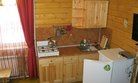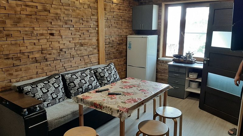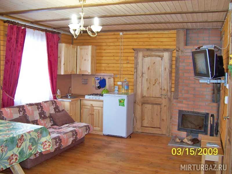В спальне две двуспальные кровати, тумбочка. На кухне дровяная печь, диван, кухонный уголок с газовой плиткой и всей необходимой посудой, мойка. На улице крытая терраса, стол, мангал. Туалет и душ-отдельная пристройка в центре базы.