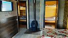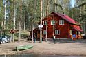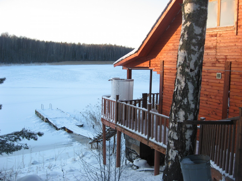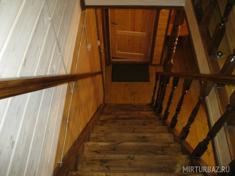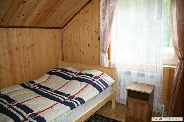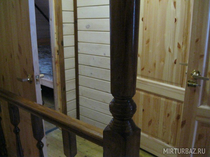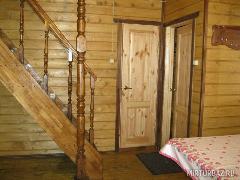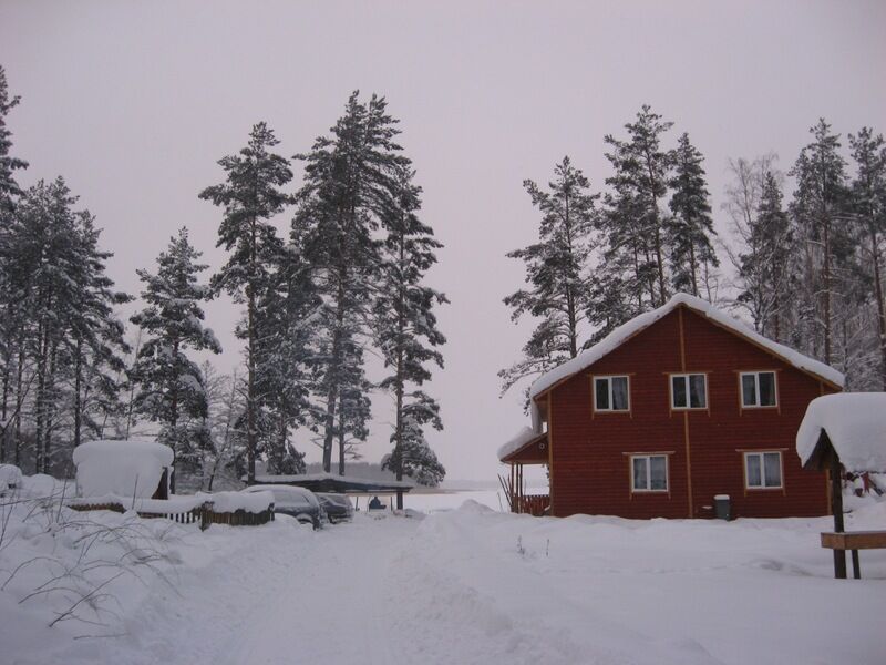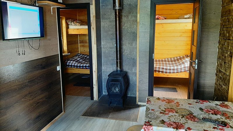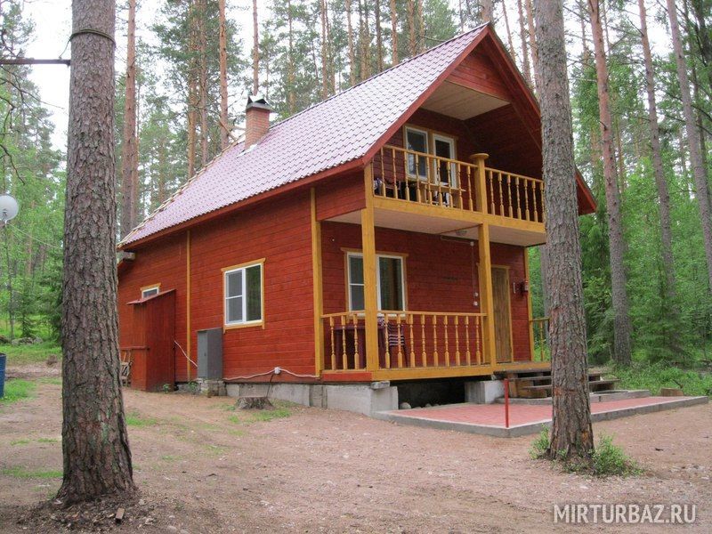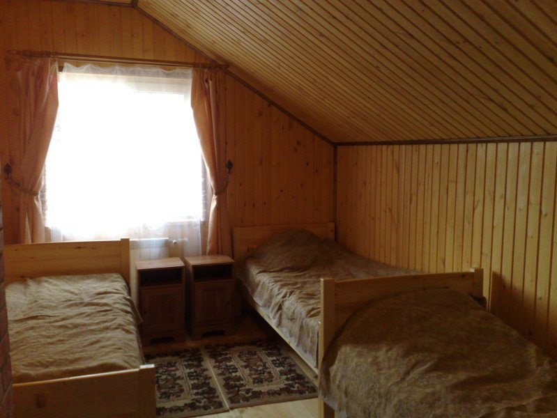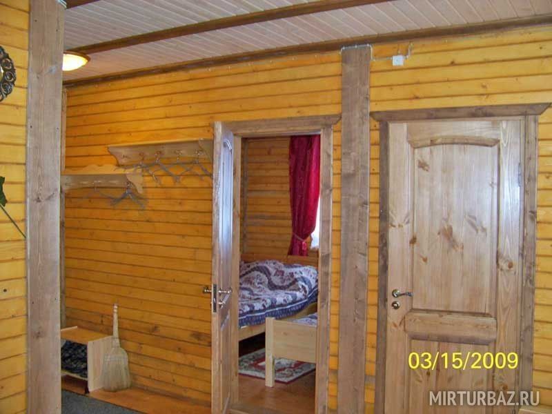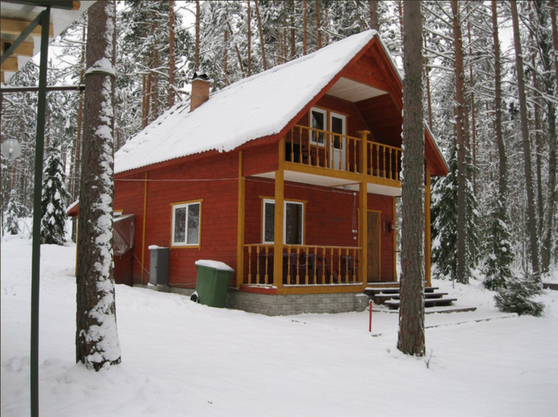 Состоит из 2-х половин, вместимость каждой до 8-человек. В доме есть сауна, душ, два туалета, по одному в каждой половине соответственно, телевизор, холодильник. В 1-й половине есть камин, так же в 1-й половине находится 3 спальни: в первой расположено 3 односпальные кровати, во второй 1 двухспальная, в третьей 1 двухспальная и 1 односпальная. Во второй половине так же имеется 3 спальни.