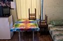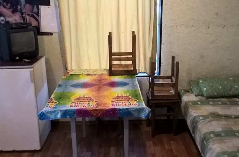 В спальне - 2 односпальные кровати, на кухне - газовая плитка, мойка, вся необходимая посуда для приготовления пищи и для еды, небольшой диванчик. Перед домом - стол, скамейка, мангал, до воды - 30 м. Удобства в отдельном помещении в центре базы.