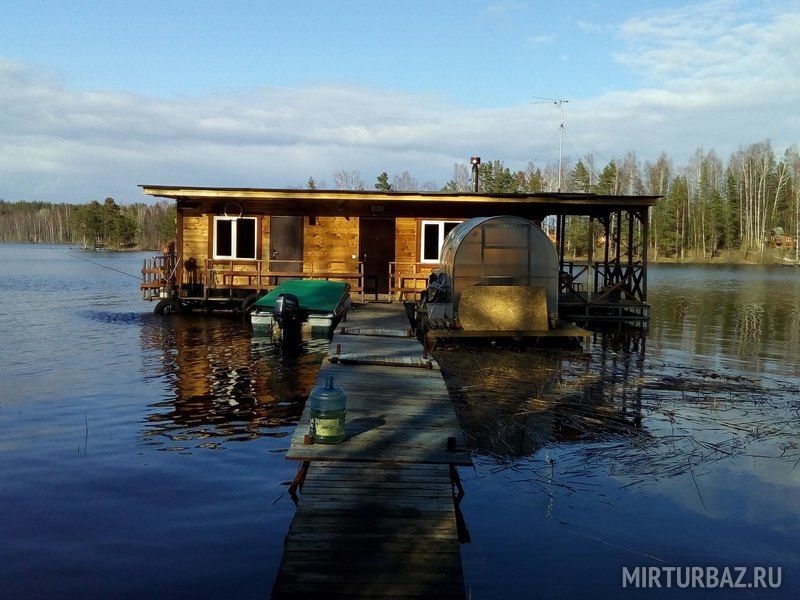 Дебаркадер-дом на воде. В доме есть душ, туалет, телевизор, холодильник, кухня и две спальни.