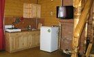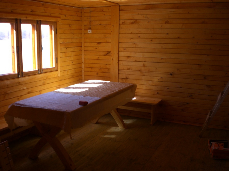 Две двухъярусные кровати, дровяная печка, кухонный уголок со всей необходимой посудой и газовой плиткой, рукомойник. На берегу столик, скамейка, мангал. Туалет и душ-отдельная пристройка в центре базы.