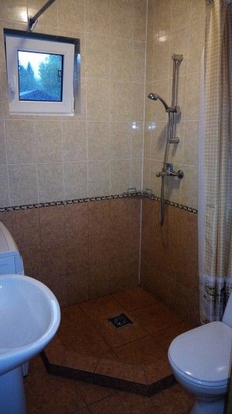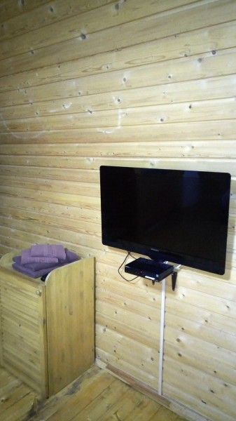 На первом этаже гостиная с двуспальным диваном, обеденной зоной и спутниковым ТВ. На втором этаже спальня с двумя кроватями 90*200, с возможностью их объединения. В гостиной также расположена мини-кухня с холодильником, микроволновой печью, варочной поверхностью и чайником. Комплект столовой посуды на 4 человека, кастрюли, сковорода. Санузел совмещен, оборудован системой «теплый пол», есть душ и фен.