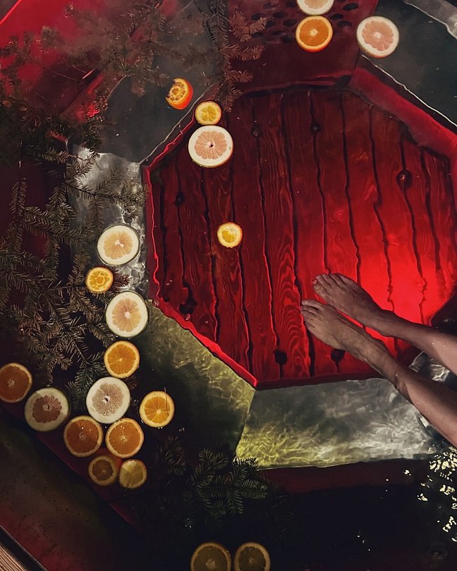Есть функция гидромассажа и яркой подсветки. Перед каждым заселением гостей купель тщательно моют и наполняют ее чистейшей артезианской водой.