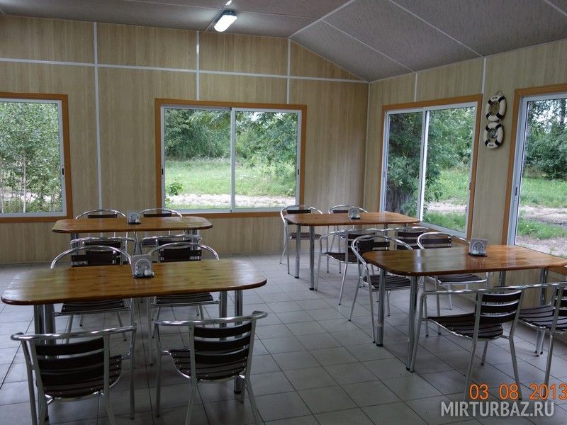 Каждый гостевой домик огорожен и имеет место для парковки автомобиля. Прямо на берегу водоема располагаются чудесные просторные беседки, в которых можно весело провести время в кругу друзей, или устроить незабываемый романтический ужин с любимым человеком. Для рыбаков на берегу сооружены специальные мостики, также можно порыбачить в тихой заводи с плавучего понтона или выйти на лодке в открытую воду. Отведать вкуснейшие блюда русской и узбекской кухни можно в кафе «Березка», которое находится на территории базы. Банкетный зал кафе «Березки» рассчитан на 30 посадочных мест и всегда готов принять гостей.
