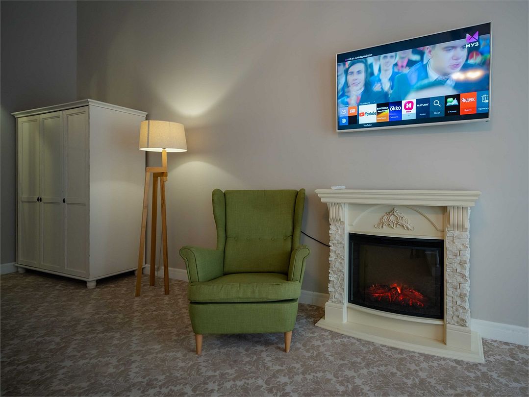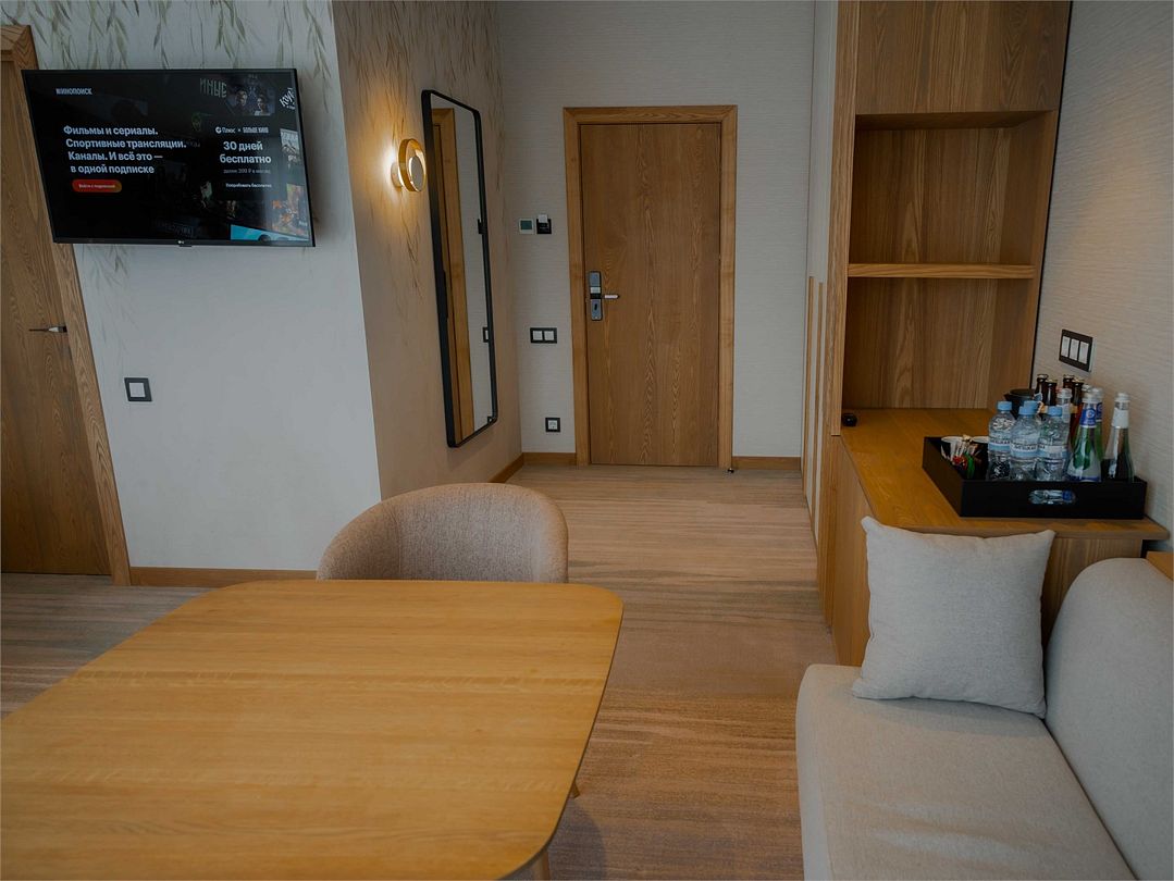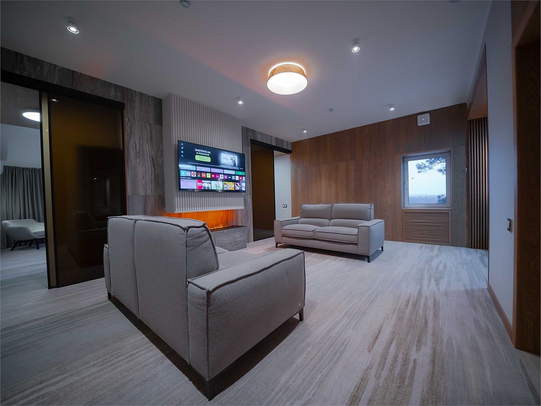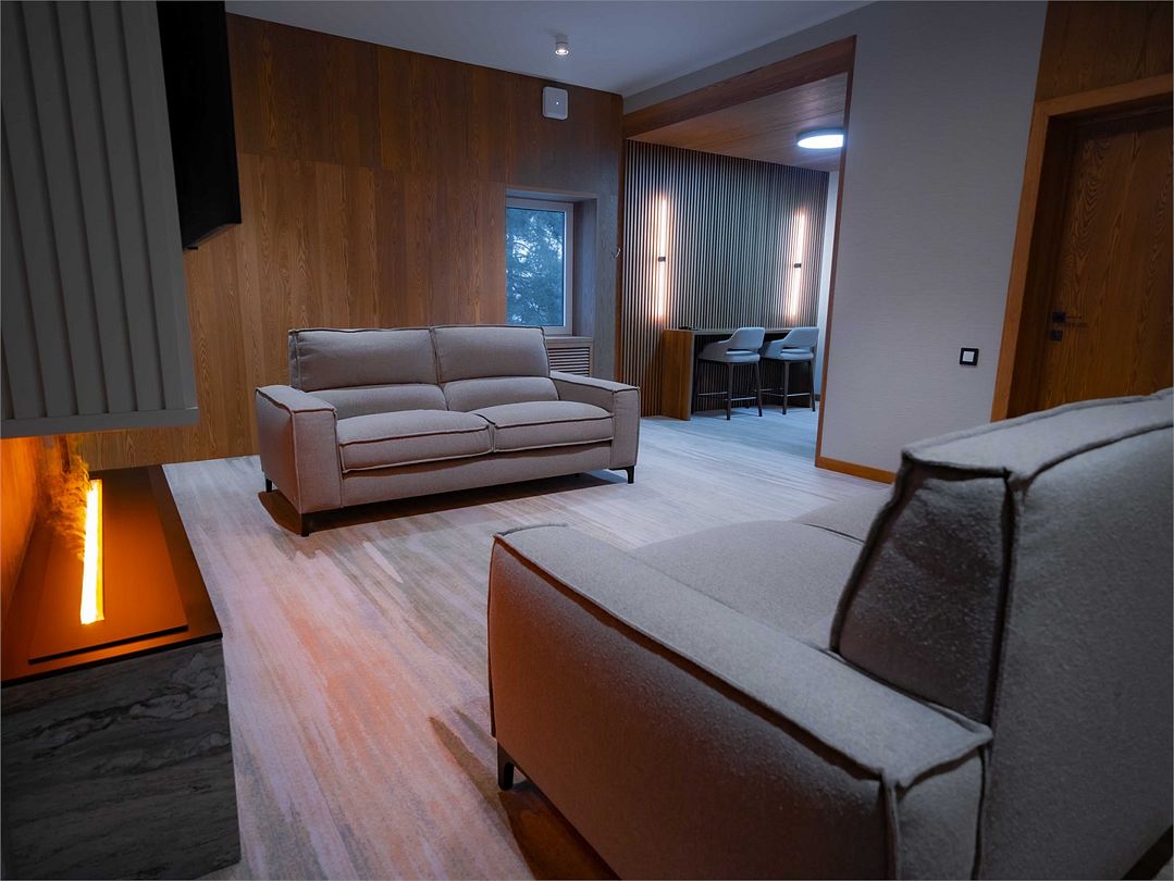Лучший номер в коллекции номеров Goritsy Family Club. Стильная мебель и декоративные предметы интерьера гостиной создают неповторимую атмосферу в сочетании с дымчатым дубом, стеклом и светлым кирпичом.