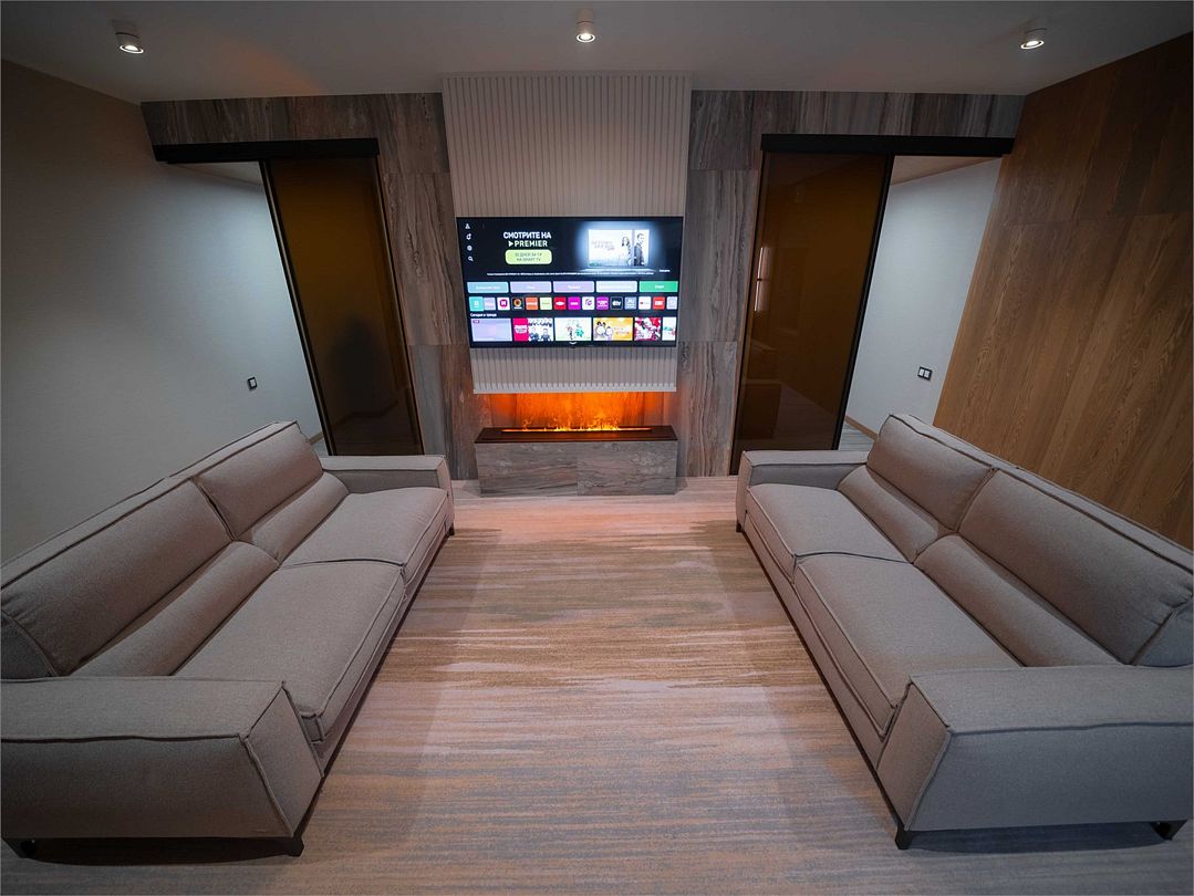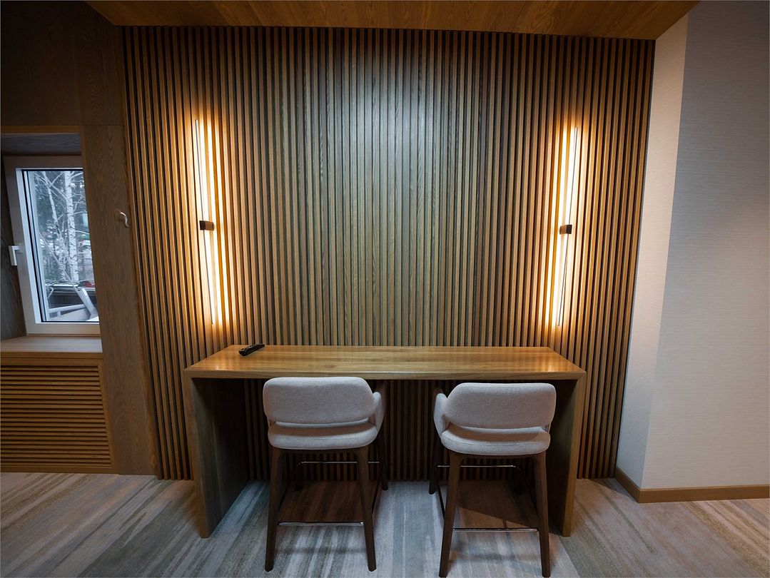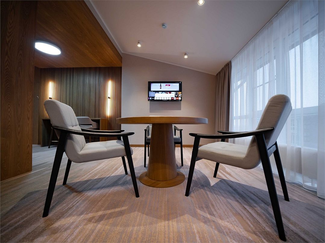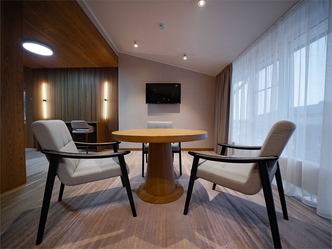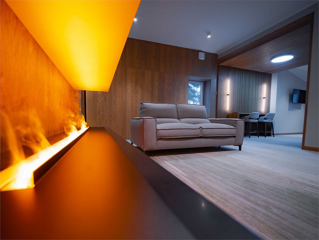 Лучший номер в коллекции номеров Goritsy Family Club. Стильная мебель и декоративные предметы интерьера гостиной создают неповторимую атмосферу в сочетании с дымчатым дубом, стеклом и светлым кирпичом.