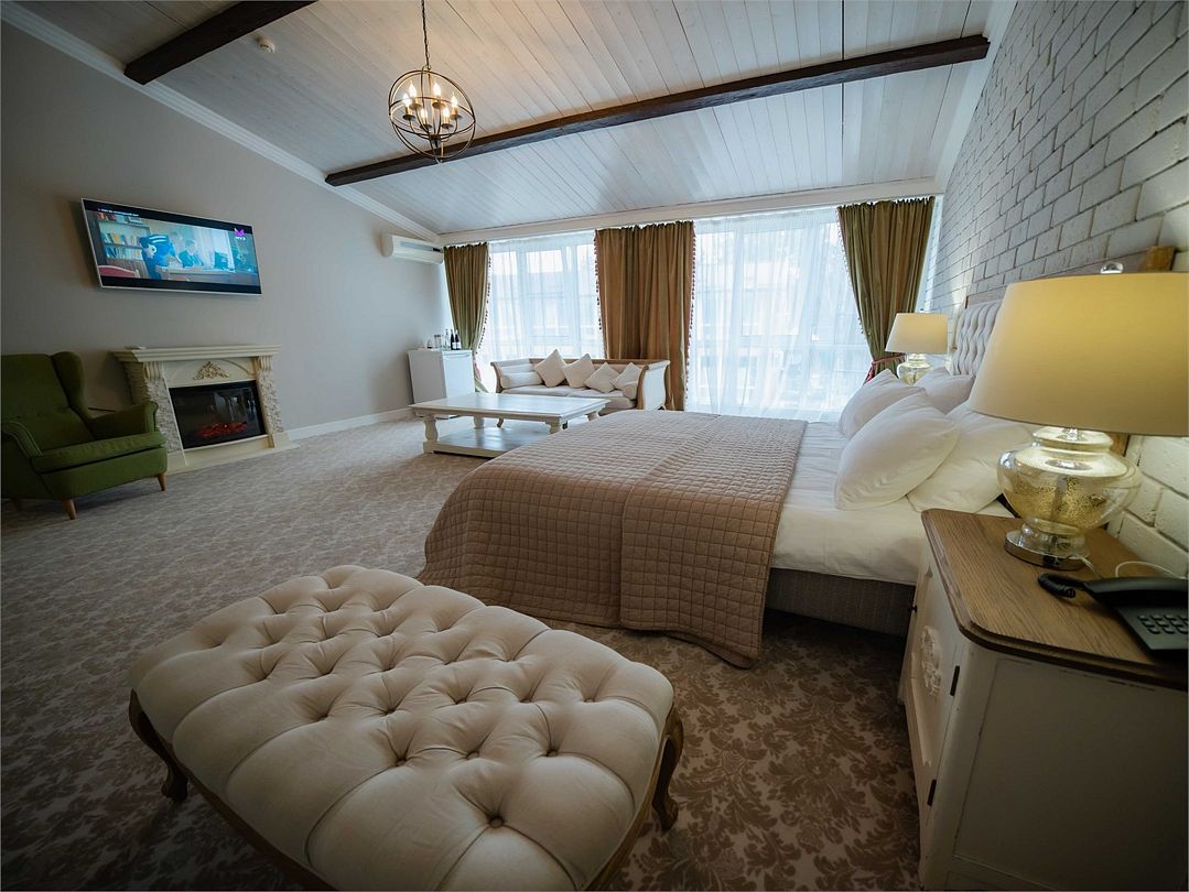 Пространство гостиной удачно разделено на комфортную зону отдыха и спальную зону. В спальной зоне номера – большая двуспальная кровать с роскошными постельными принадлежностями.