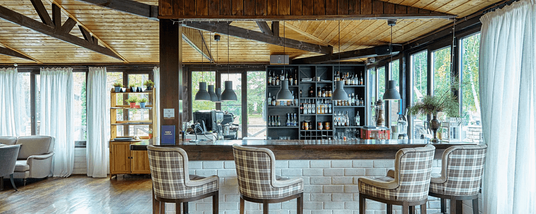 Интерьер ресторана органично вписан в окружающую природу и благоволит спокойствию и умиротворению, а с крытой и открытой веранд открывается вид на природный пейзаж.