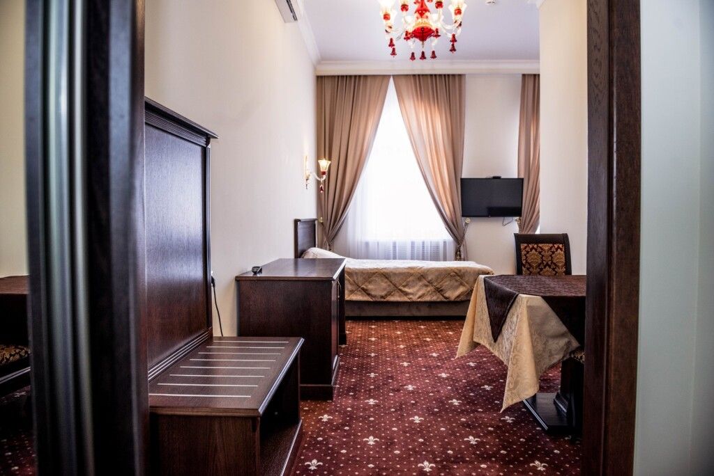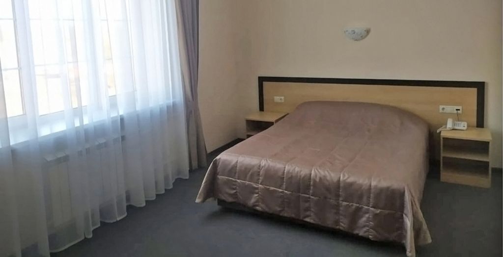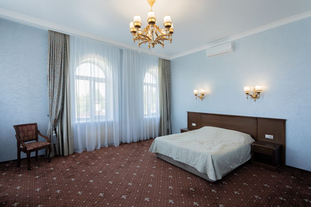 Уютный однокомнатный номер с двухспальной кроватью, общей площадью 36,7 кв.м., в котором могут разместиться один или два человека (за отдельную стоимость предоставляем доп. место на 3 гостя, без включенного завтрака. Завтрак приобретается отдельно при заселении). Дети до 6 лет, без отдельного места проживают бесплатно Удобства в номере: кондиционер, шкаф/гардероб, фен, холодильник, телефон, рабочий стол, телевизор с плоским экраном (кабельные каналы), тапочки, халат, полотенца, туалетные принадлежности. Есть мини-бар (оплачивается отдельно по прейскуранту). В стоимость номера входит завтрак, посещение бильярда, бассейна и тренажерного зала.Номер «Люкс» (Корпус 1)