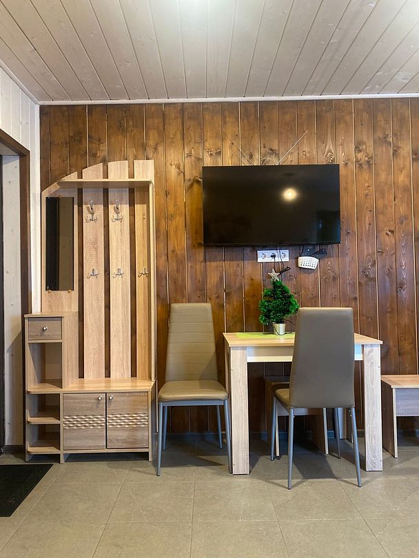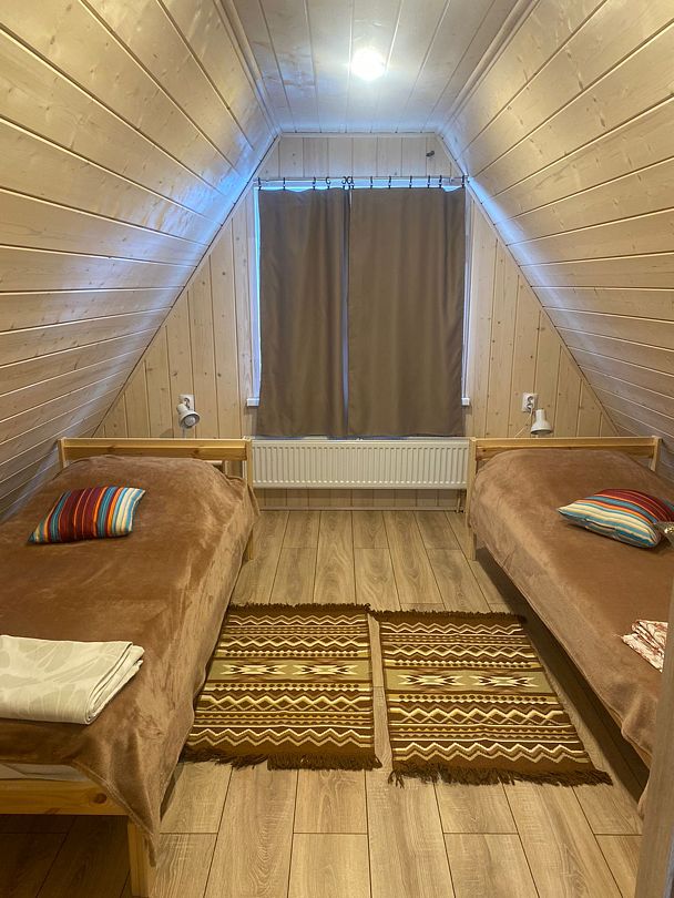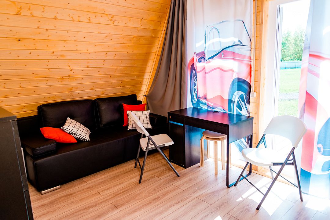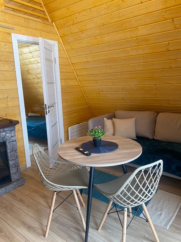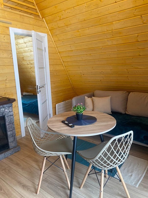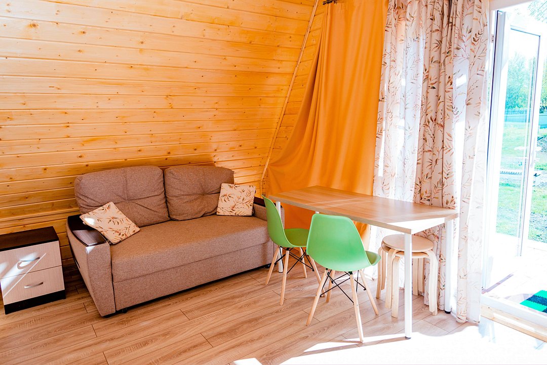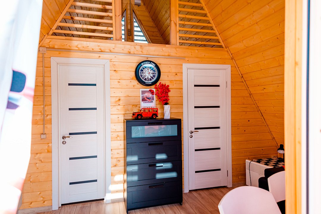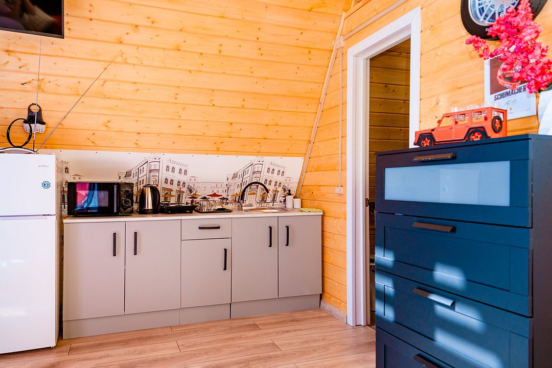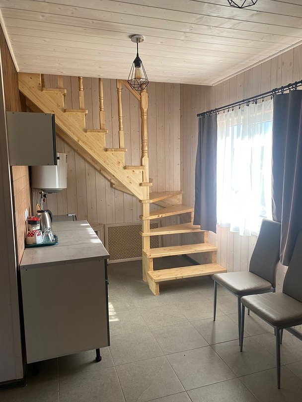 Дома с мини-кухней, рассчитанные на 4х гостей. Двухэтажные. На первом этаже кухня, санузел, душ, кровать или диван, телевизор, холодильник, стол, стулья, тёплый пол. На втором этаже комната с односпальными кроватям
