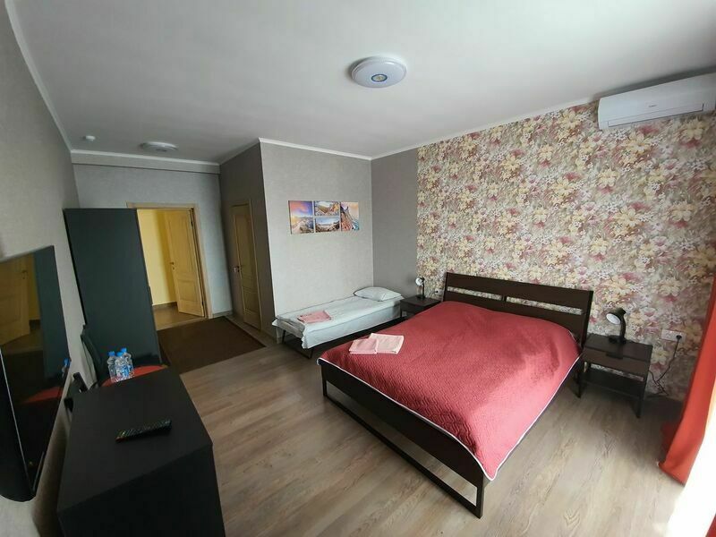 Двухкомнатный номер с выходом на балкон предназначен для проживания до 5 человек. Первая комната площадью 21 кв.м. с выходом на балкон оборудована двуспальной кроватью 160х200, 2-мя прикроватными тумбочками с 2-мя настольными лампами, шкафом-гардеробом, журнальным столиком и 2-мя стульями. Вторая комната с выходом на балкон имеет площадь 21 кв.м. В комнате имеются следующие удобства: 3 кровати 90х200, 3 прикроватные тумбочки, 3 настольные лампы, прихожая — вешалка для одежды с полкой для обуви. В номере имеется санузел с душем и туалетными аксессуарами. В номере есть кондиционер, холодильник, телевизор, тумба для телевизора, чайник, набор чайной посуды на 5 персон, набор для душа, полотенца.