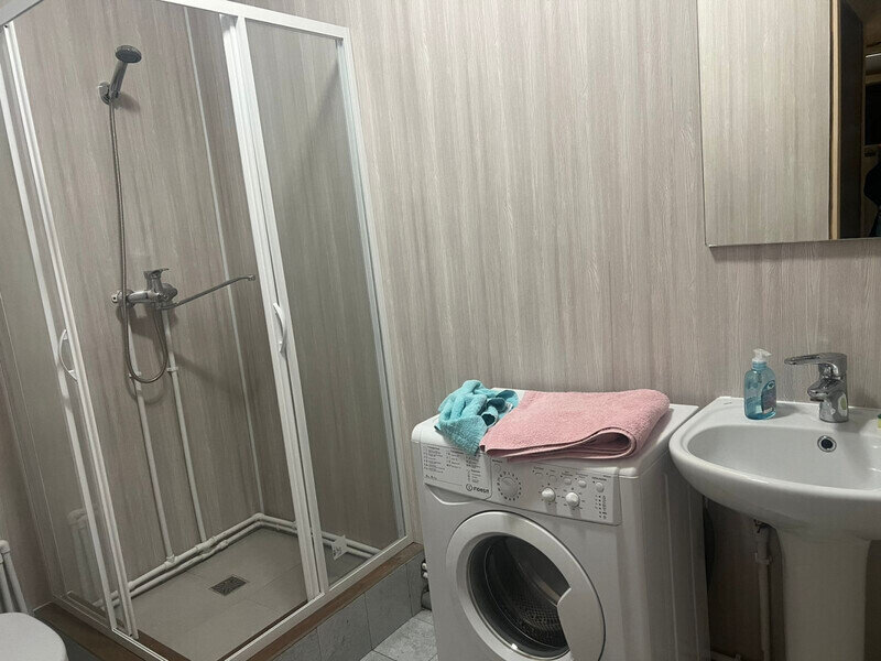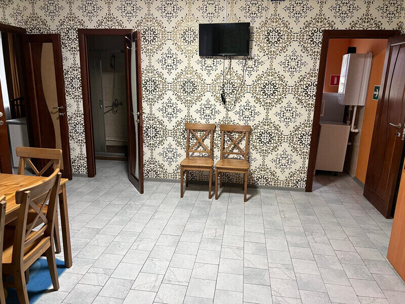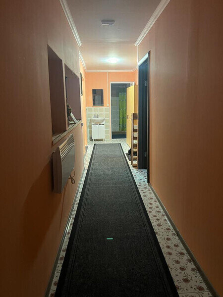 Общий коридор, общий душ, два туалет, кухня для перекуса, холодильник, стол, стулья, микроволновая печь, чайник.