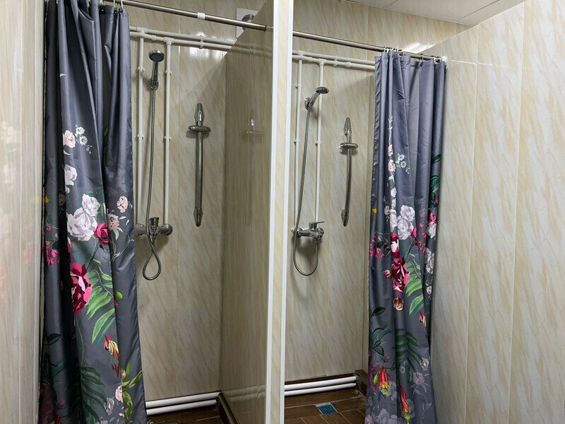 Общий коридор, общий душ: 4 кабинки, три туалета, кухня-терраса для перекуса, холодильник, стол, чайник.
