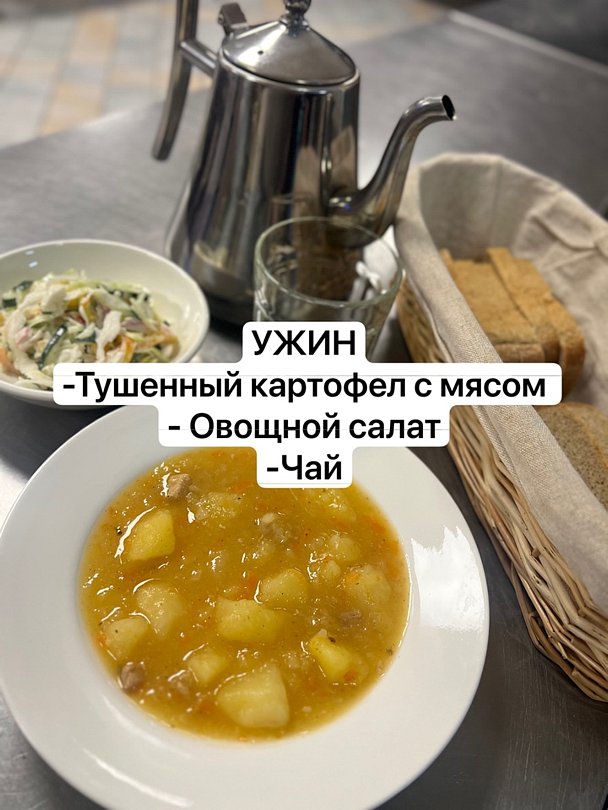 - Обед (примерный набор :суп , картофельное пюре, котлета, салат овощной, булочка собственная выпечка, чай или компот).