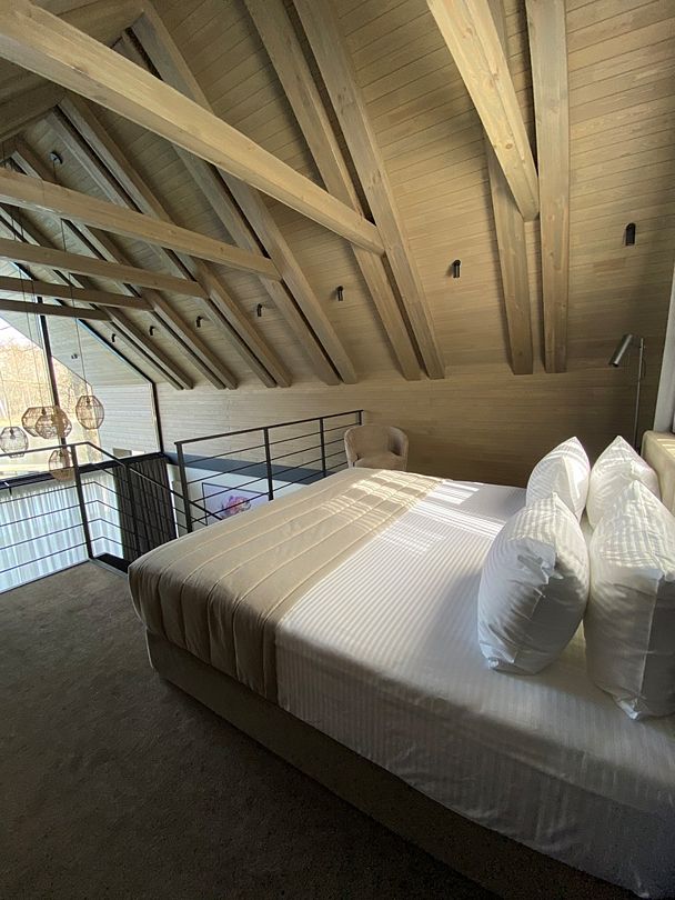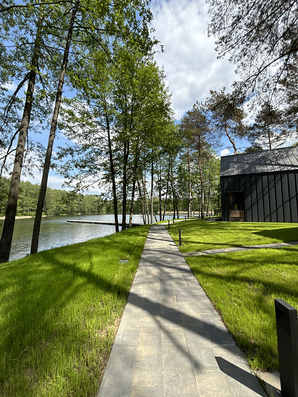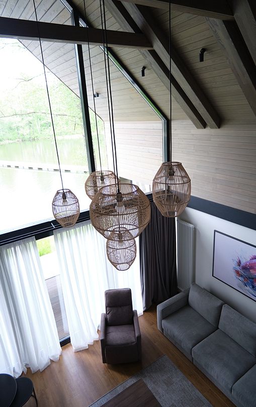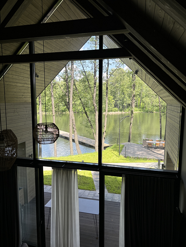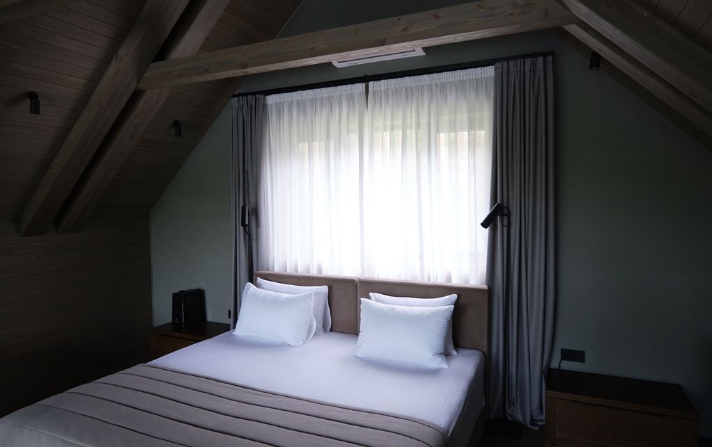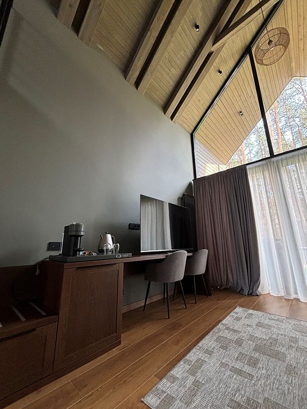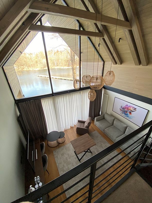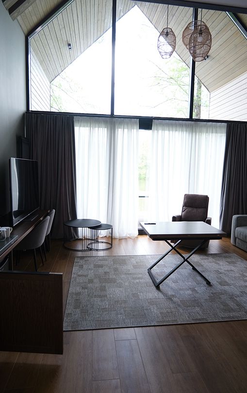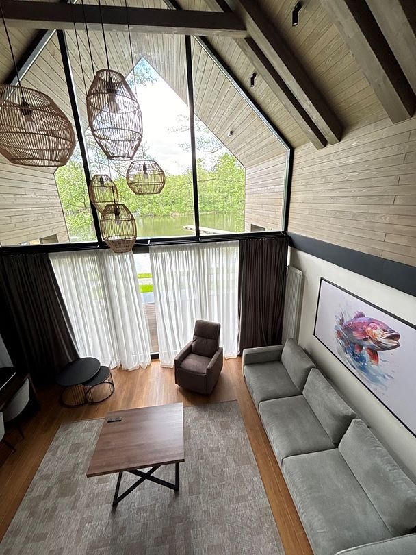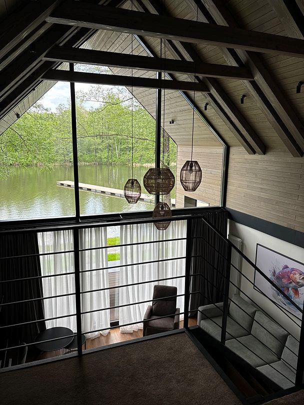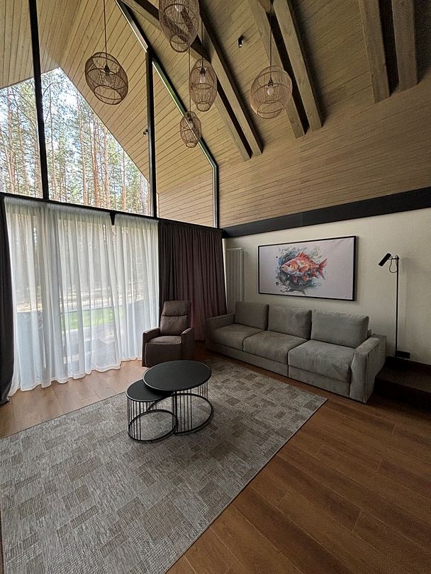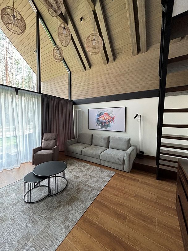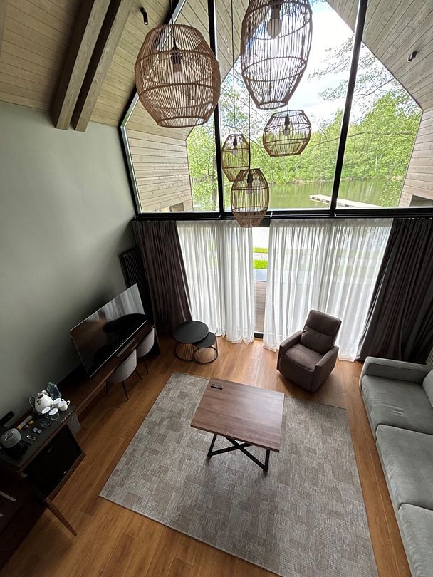 Здесь вы будете проживать в просторном стильном доме с панорамными окнами, откуда, в зависимости от вашего выбора домика, открывается захватывающий вид на озеро или лес. Внутри: современная техника, удобная мебель и все необходимое для беззаботного отдыха. Забудьте о бессоннице на ортопедических матрасах комфортных подушках, созданных специально для вас. Ванные комнаты оснащены тёплыми полами; есть тропический душ и гигиенический душ, мягкие полотенца и роскошные халаты дополнят картину идеального отдыха. А эксклюзивная линейка косметических средств для душа порадует даже самых взыскательных гостей.