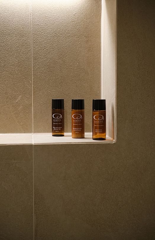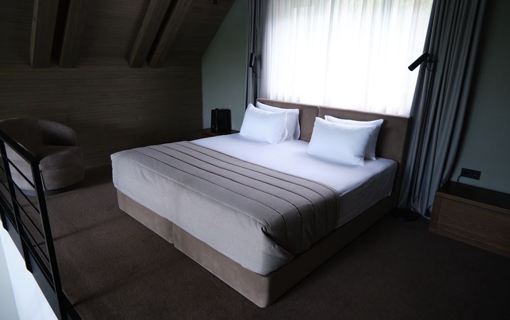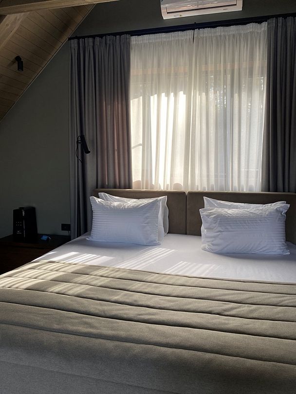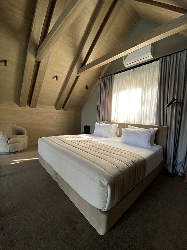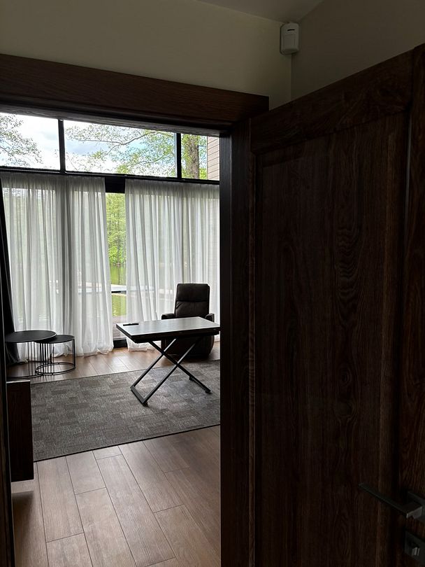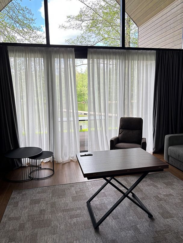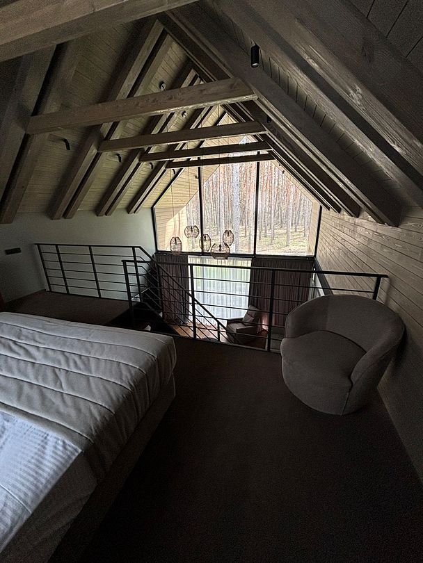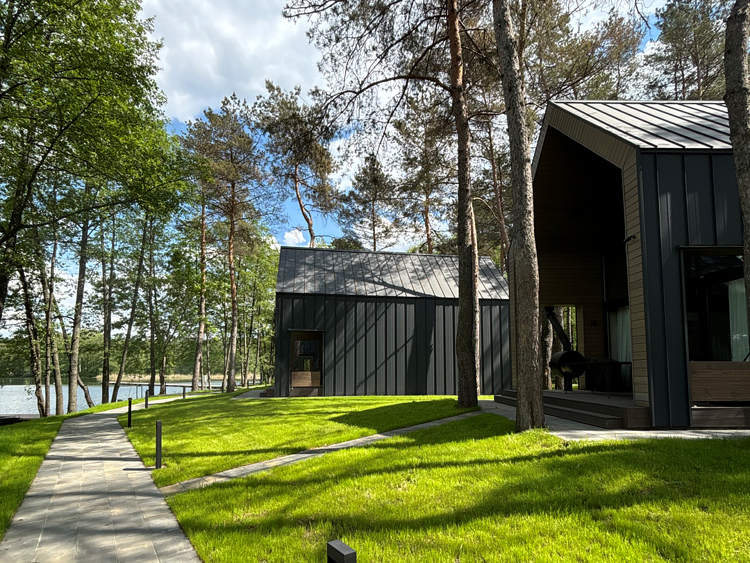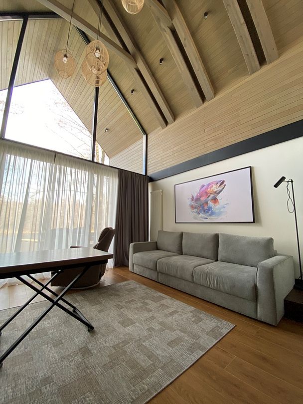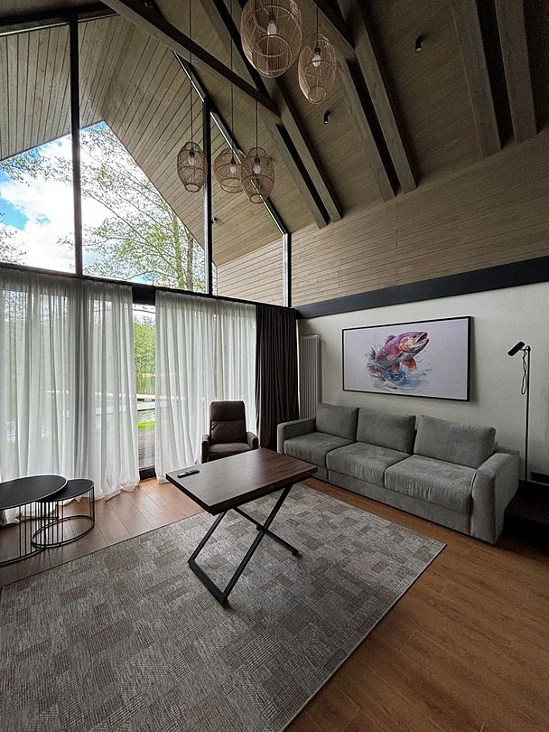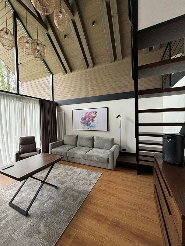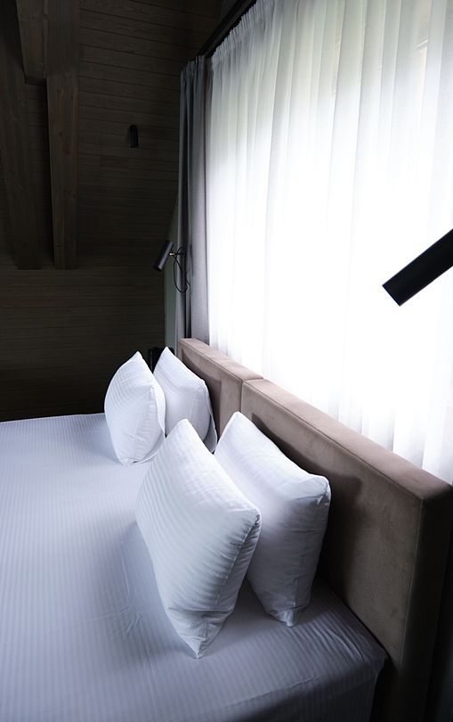 Здесь вы будете проживать в просторном стильном доме с панорамными окнами, откуда, в зависимости от вашего выбора домика, открывается захватывающий вид на озеро или лес. Внутри: современная техника, удобная мебель и все необходимое для беззаботного отдыха. Забудьте о бессоннице на ортопедических матрасах комфортных подушках, созданных специально для вас. Ванные комнаты оснащены тёплыми полами; есть тропический душ и гигиенический душ, мягкие полотенца и роскошные халаты дополнят картину идеального отдыха. А эксклюзивная линейка косметических средств для душа порадует даже самых взыскательных гостей.