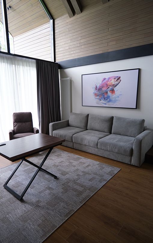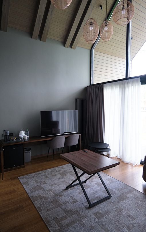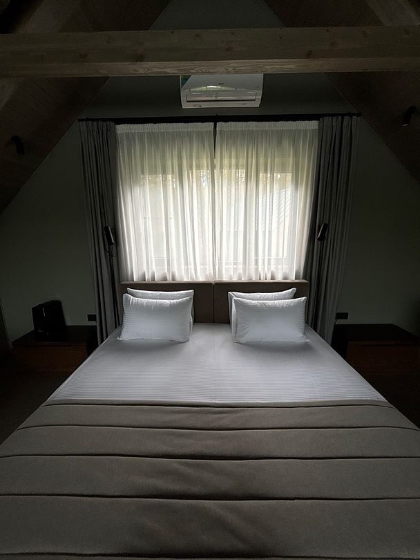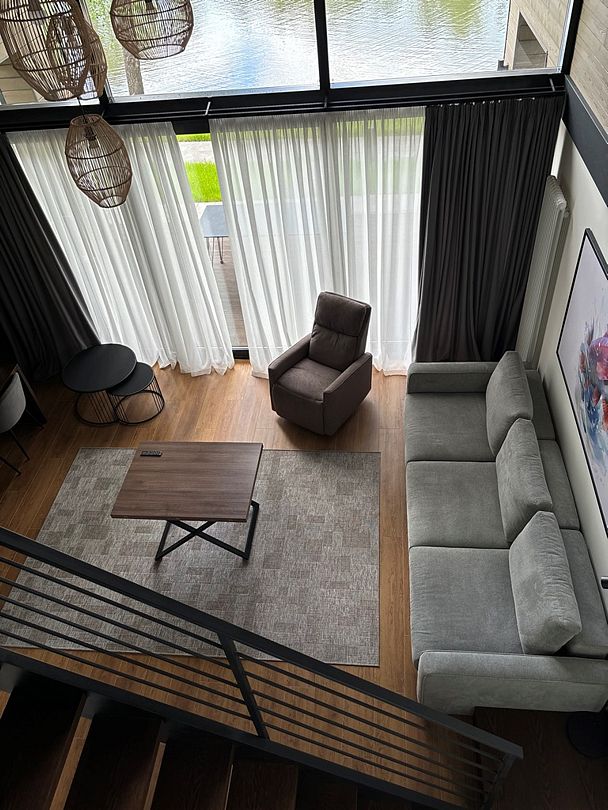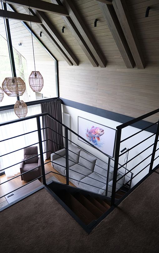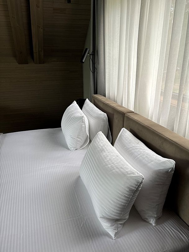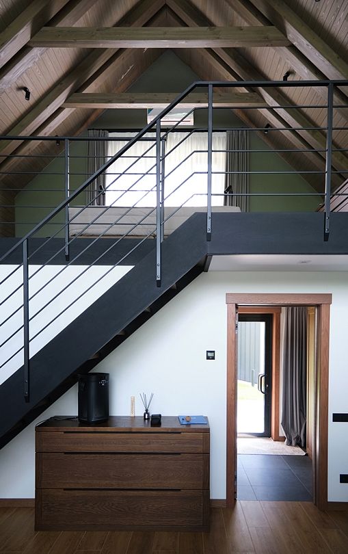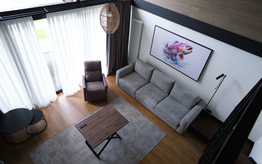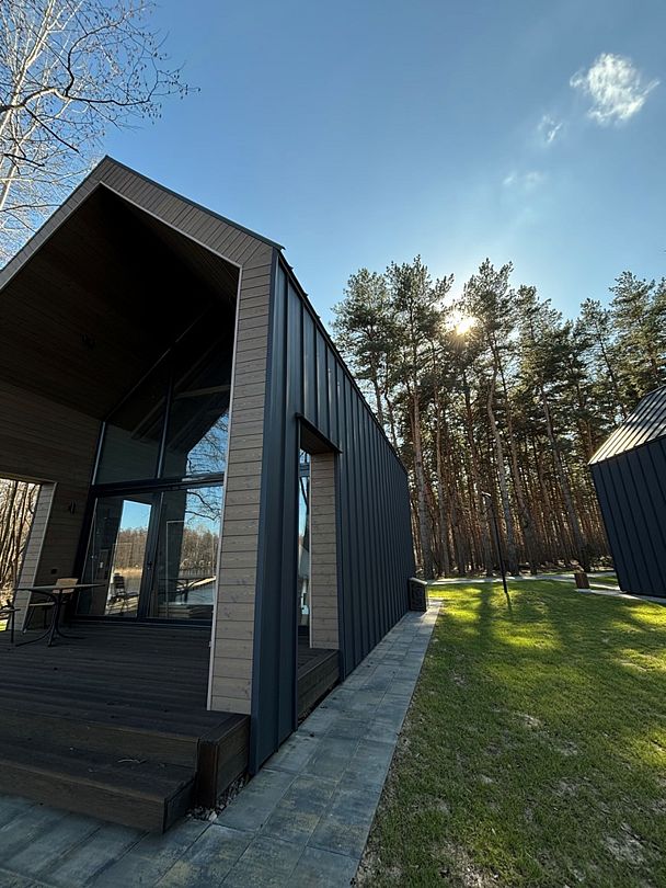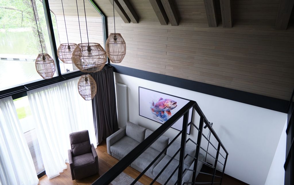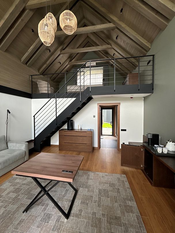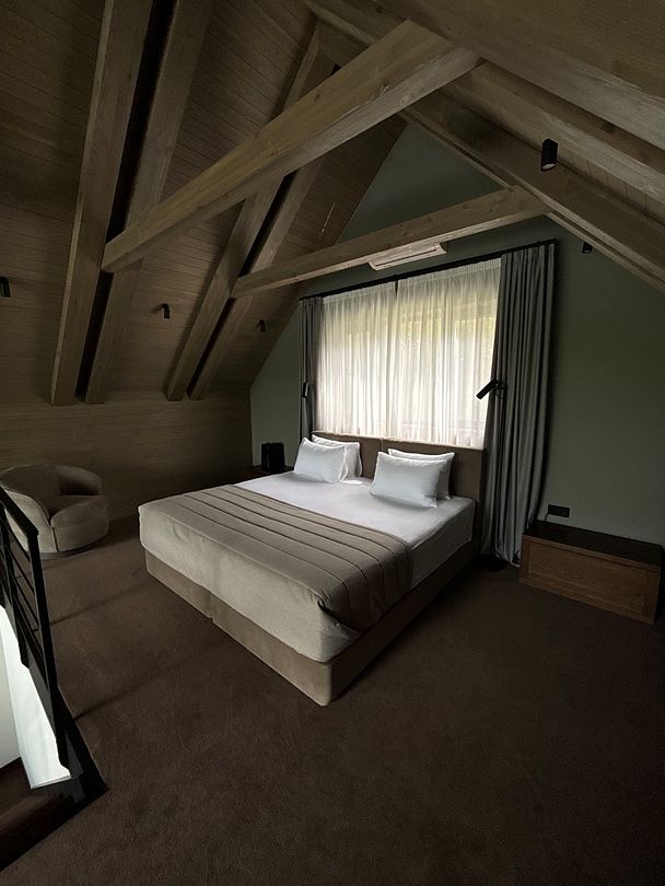 Здесь вы будете проживать в просторном стильном доме с панорамными окнами, откуда, в зависимости от вашего выбора домика, открывается захватывающий вид на озеро или лес. Внутри: современная техника, удобная мебель и все необходимое для беззаботного отдыха. Забудьте о бессоннице на ортопедических матрасах комфортных подушках, созданных специально для вас. Ванные комнаты оснащены тёплыми полами; есть тропический душ и гигиенический душ, мягкие полотенца и роскошные халаты дополнят картину идеального отдыха. А эксклюзивная линейка косметических средств для душа порадует даже самых взыскательных гостей.