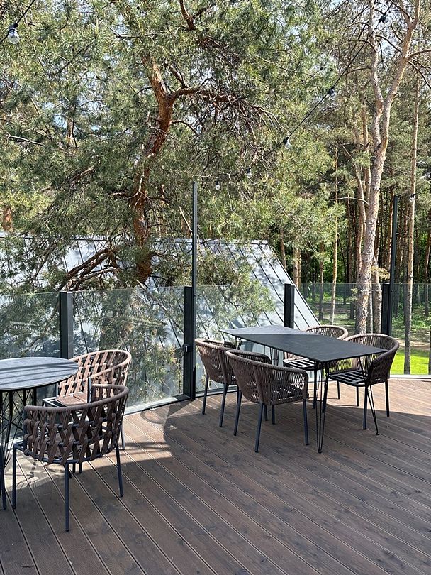 На территории есть форелевая рыбалка, летняя зона отдыха с шезлонгами, открытая веранда с видом на лес, трёхэтажный ресторан со смотровой площадкой.