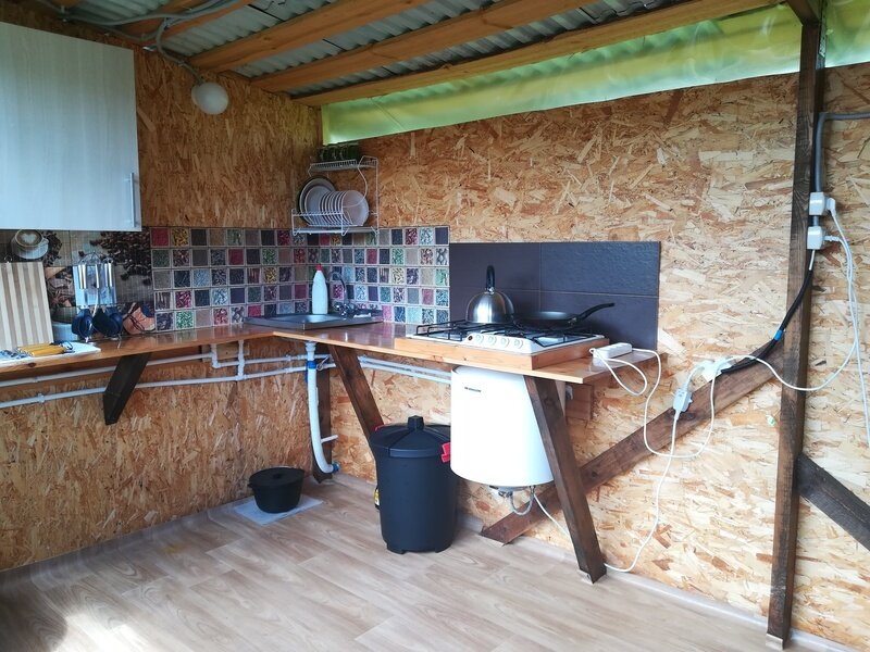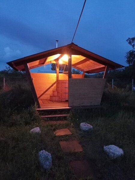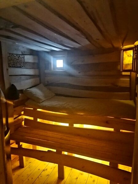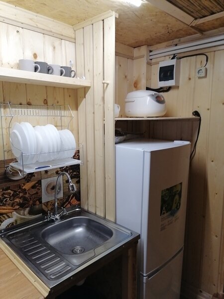 Также на территории глэмпинга есть домик с баней, который доступен для проживания круглый год. Вы можете арендовать дом и баню отдельно. Дом рассчитан на комфортное проживание до 6 человек и оснащен всем необходимым для приятного отдыха — кухней с холодильником, двумя «капсульными каютами» с двуспальными кроватями, диваном, санузлом, телевизором, теплыми полами, караоке, Wi-Fi, мангальной зоной.