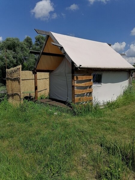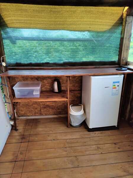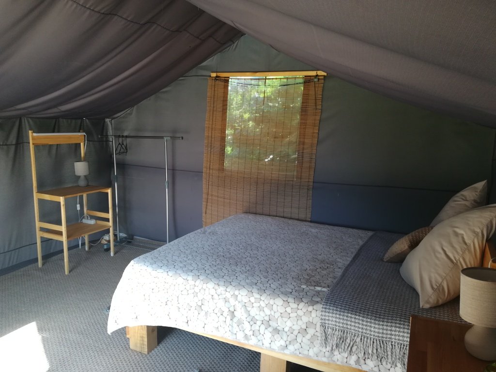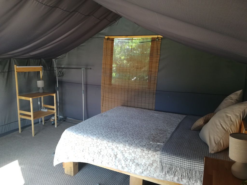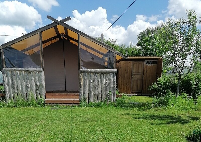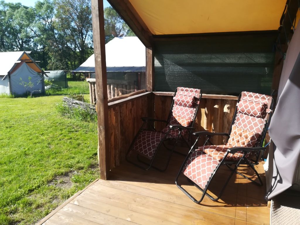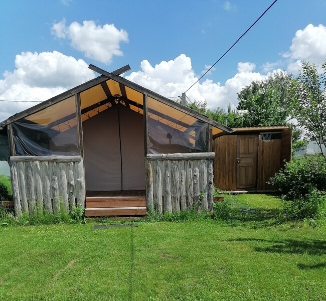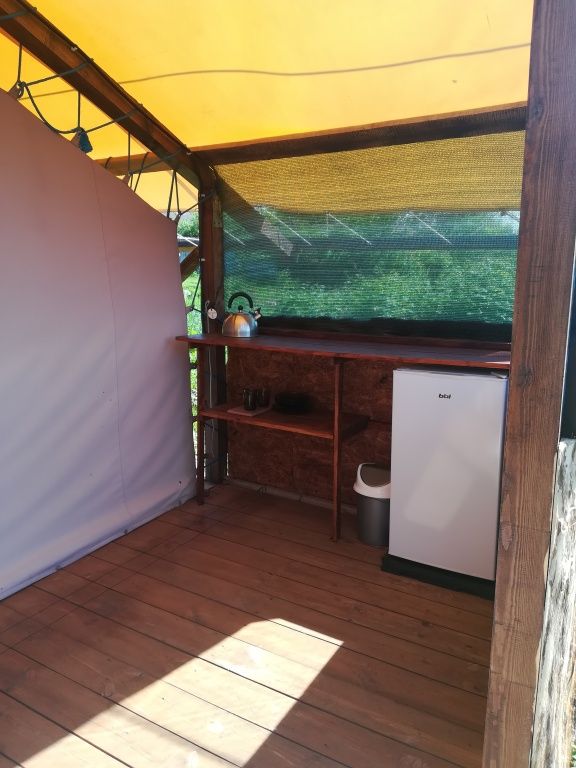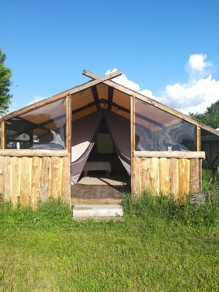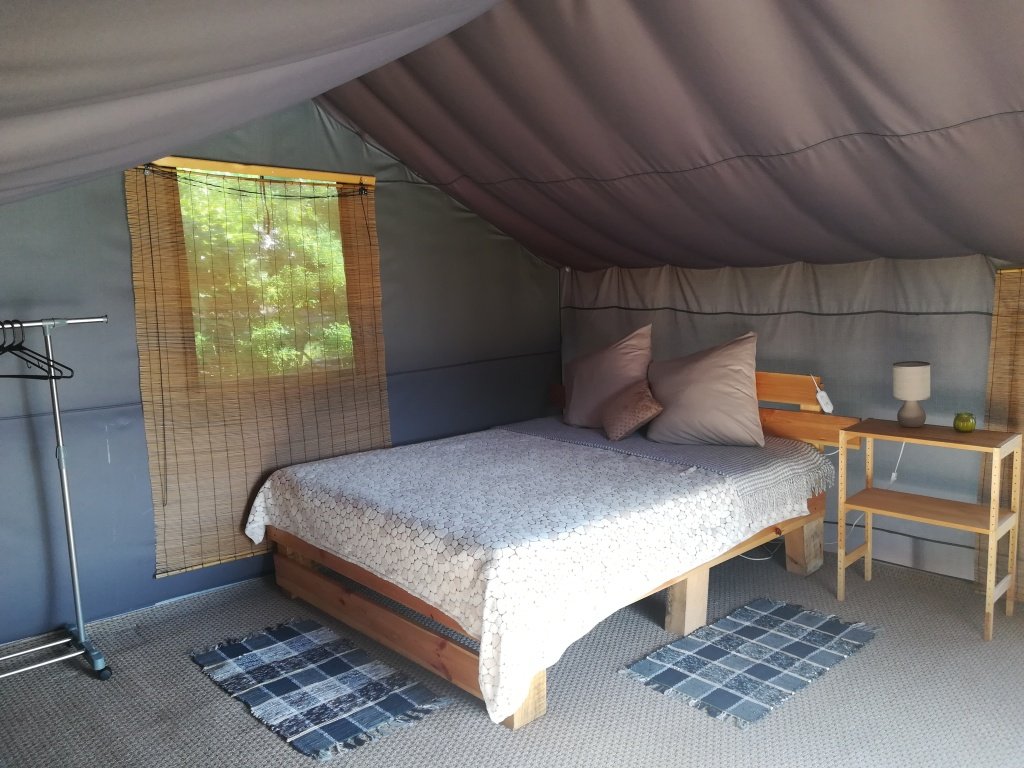 На территории глэмпинга предоставляется уютное размещение в трех комфортабельных шатрах с мая по сентябрь. Каждый шатер оснащен удобными кроватями с электрическими простынями, собственным санузлом и террасой, где вы найдете мини-кухню с холодильником и всем необходимым набором посуды.