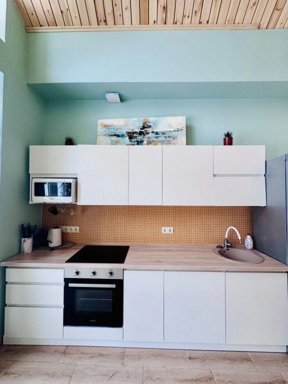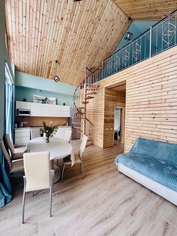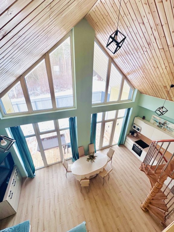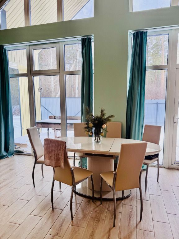 В доме просторная гостиная с большими окнами и видом на природу, кухня с современными удобствами, уютные спальни с комфортными кроватями.