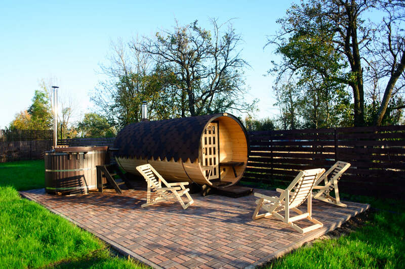 Аренда бани-бочки и купели: великолепная парилка с зоной для чаепития, купель с подогревом, полотенца, халаты. Рассчитана на 6 человек. Чан с горячей водой входит в стоимость.