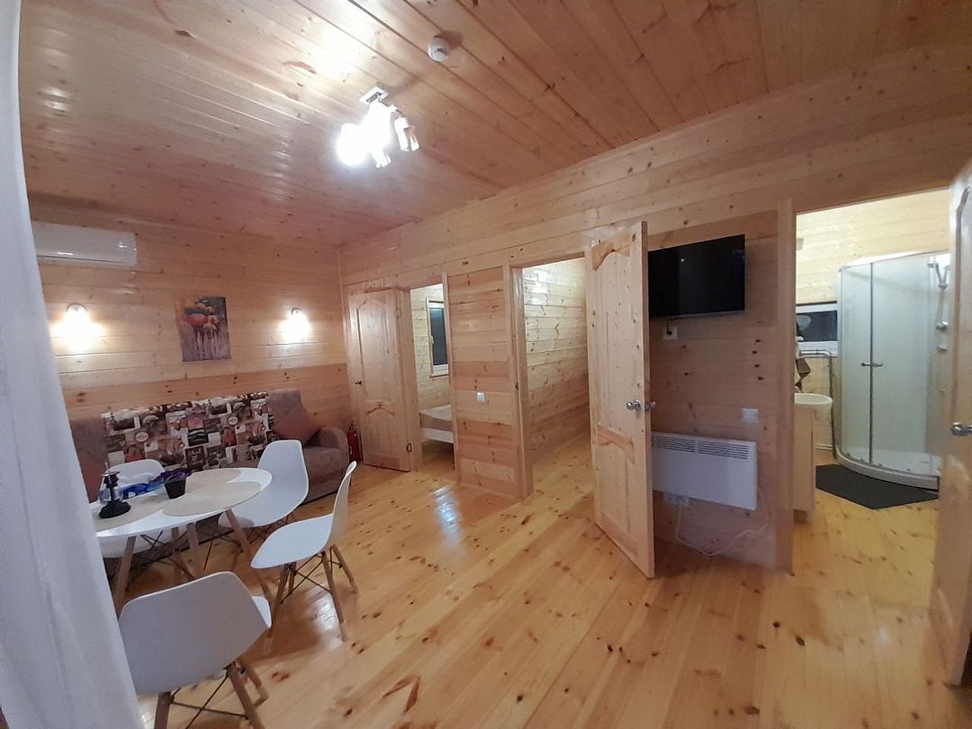 На территории имеется два коттеджа с тремя комнатами и один коттедж с двумя. Они рассчитаны на проживание до 6 и 4 человек соответственно. Гостей ждут уютные спальни, просторные гостиные, полностью оборудованные кухни, санузлы и душевые кабины. А также предоставляются наборы для пикника.