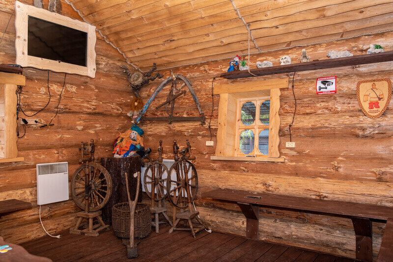 Домик Бабы-Яги выполнен в старинных русских традициях и представляет собой необычную игровую зону для малышей и подростков.