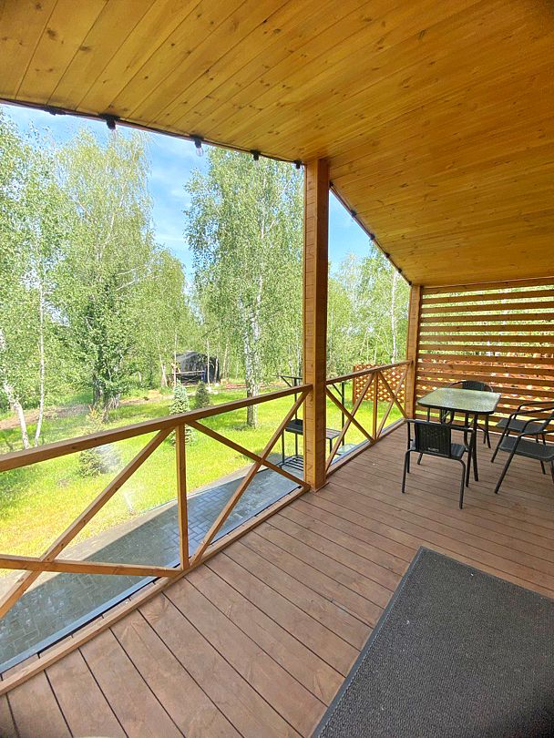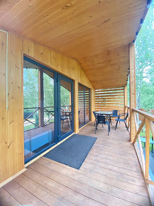 В домике двуспальная кровать, раскладной диван, телевизор, кондиционер, СВЧ, холодильник, посуда. В душевой кабине банные принадлежности, фен.