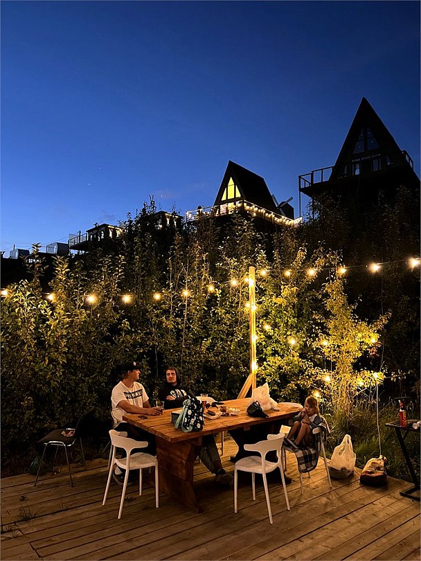На большой общей террасе вас ждёт подогреваемый чан* с функцией джакузи и атмосферной подсветкой — он подарит незабываемые эмоции и станет тем самым «горячим» моментом путешествия, который ваши гости будут вспоминать снова и снова!