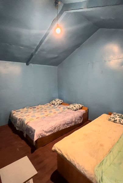 Односпальные кровати, стол, стул, чайник, раковина, туалет.