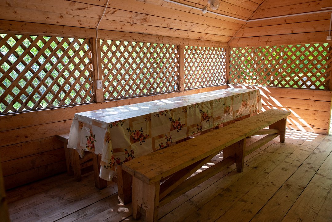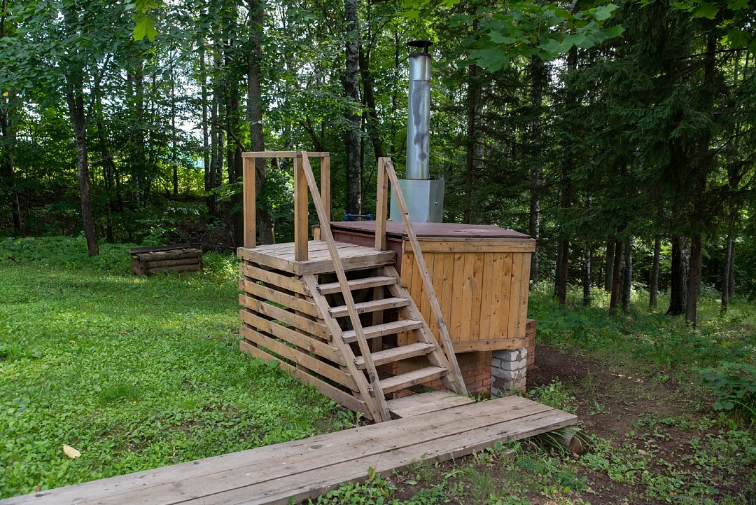 Пятая база удивляет своей самой большой купелью среди всех комплексов, баней на роднике и уютной летней беседкой.